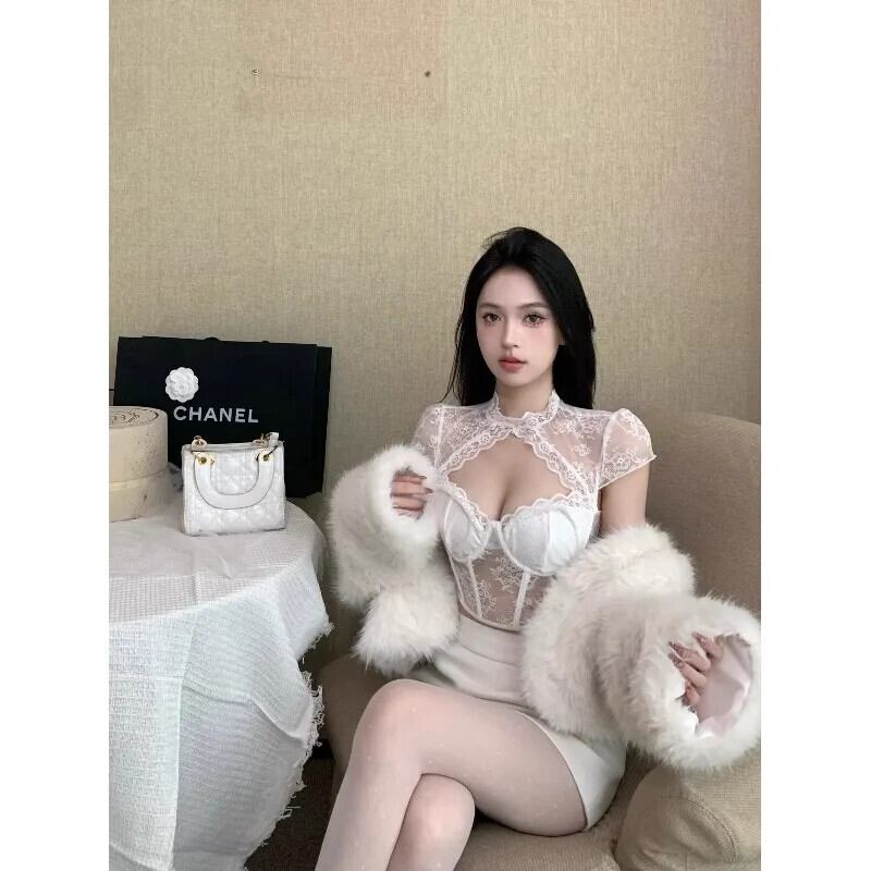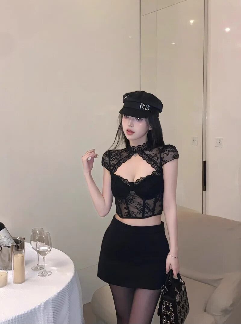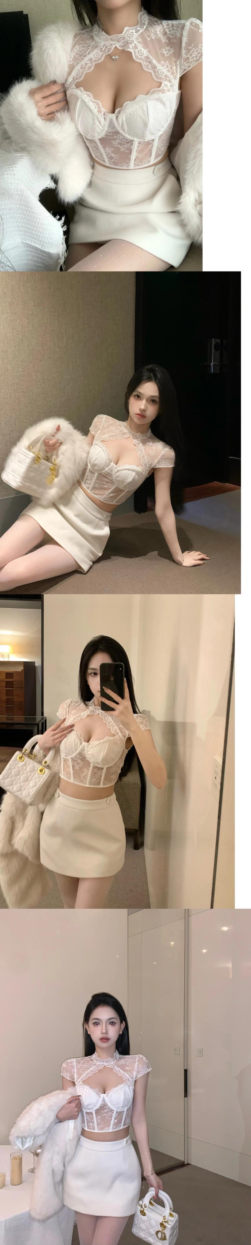 純粋セクシー甘いホットガールレース Tシャツ冬セクシースリムフィットフィッシュボーンショートトップ 大人ガーリー スウィート キュート カジュアル ウィンター 冬物