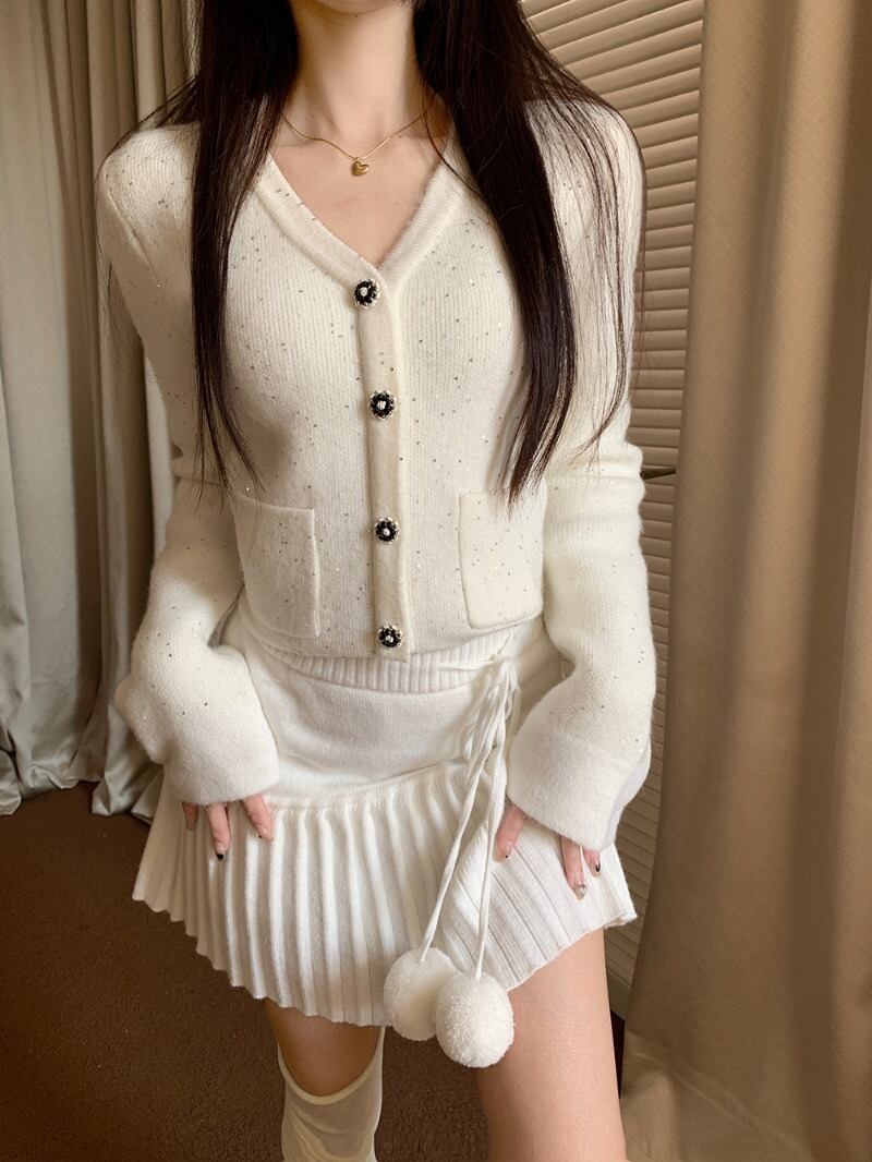 Sweet Girl プレッピー スタイル スーツ レディース 秋 スパンコール ニット カーディガン ウエスト プリーツ スカート 2 点セット 大人ガーリー スウィート キュート カジュアル オータム 秋物