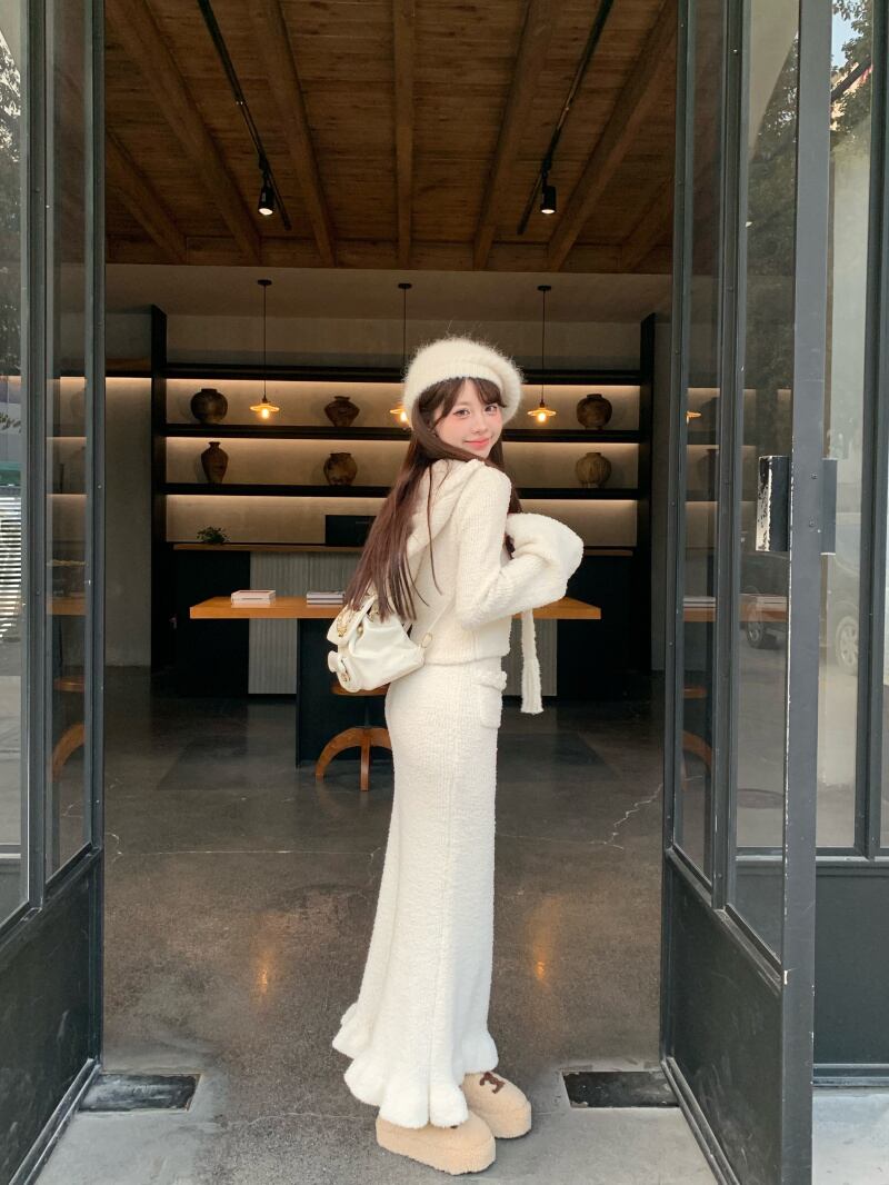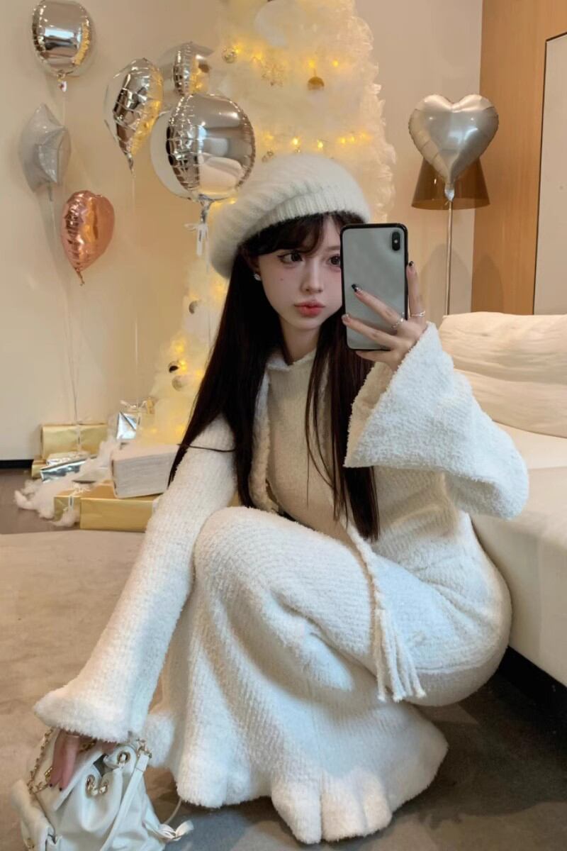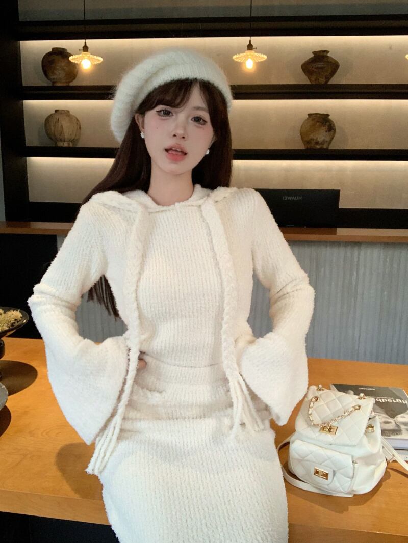 甘いホットガールスーツ秋と冬フード付きツイストセーターマーメイドロングスカートツーピースセット 大人ガーリー スウィート キュート カジュアル オータム 秋物 ウィンター 冬物