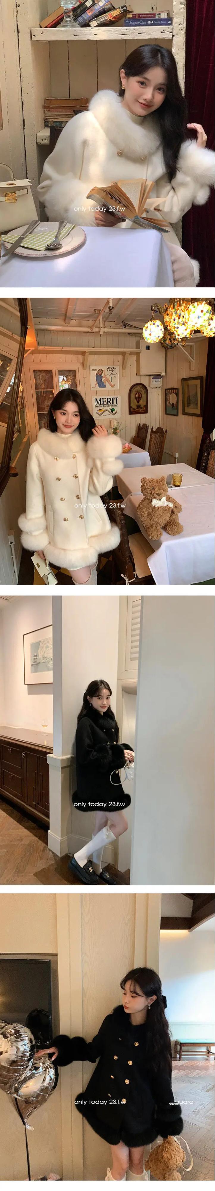 甘いホットガールフェイクファーパッチワークダブルブレストコート秋/冬厚いロングウールコート 大人ガーリー スウィート キュート カジュアル オータム 秋物 ウィンター 冬物