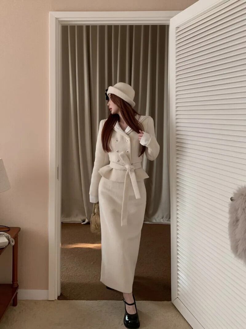 甘いホットガールスーツ冬毛皮襟コットンウールジャケットウエストロングスカートツーピースセット 大人ガーリー スウィート キュート カジュアル ウィンター 冬物