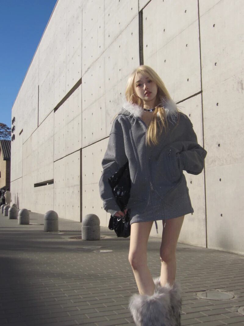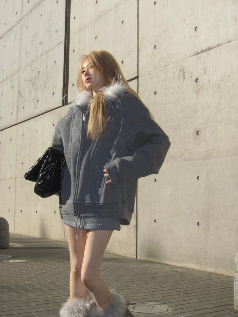 甘いホットガールスーツ冬毛皮襟フード付きジャケットウエストぬいぐるみミニスカートツーピースセット 大人ガーリー スウィート キュート カジュアル ウィンター 冬物