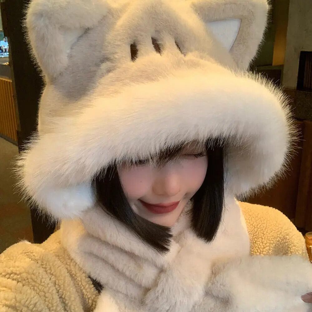 甘いホットガールキツネ耳ぬいぐるみ帽子スカーフセット秋と冬かわいいボンバー帽子トレンディアクセサリー 大人ガーリー スウィート キュート カジュアル オータム 秋物 ウィンター 冬物