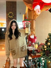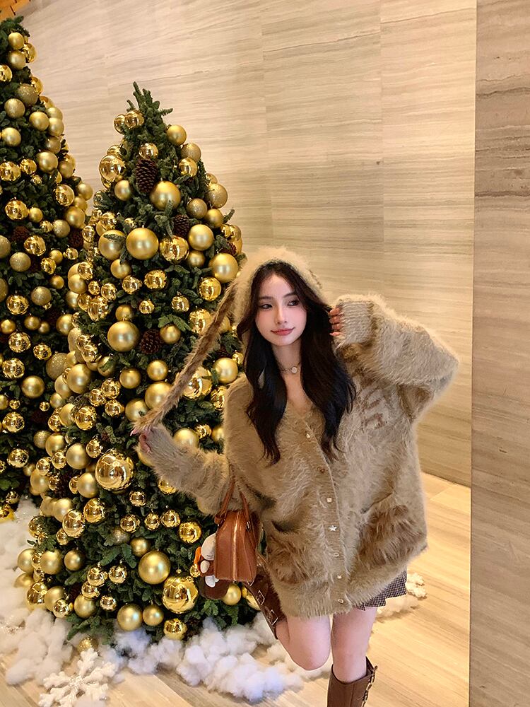 甘いホットガールウサギ耳フード付きニットカーディガン秋/冬ヒョウ柄模造ミンク毛皮セーター厚いコート 大人ガーリー スウィート キュート カジュアル オータム 秋物 ウィンター 冬物