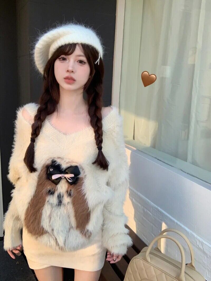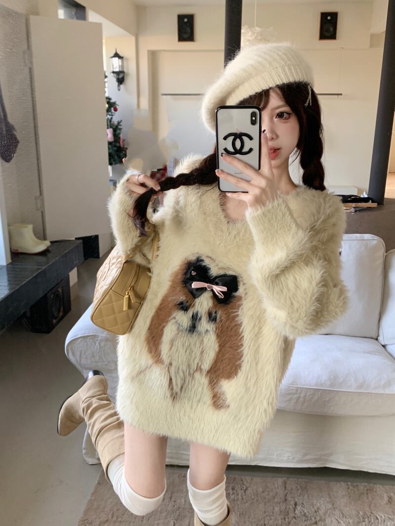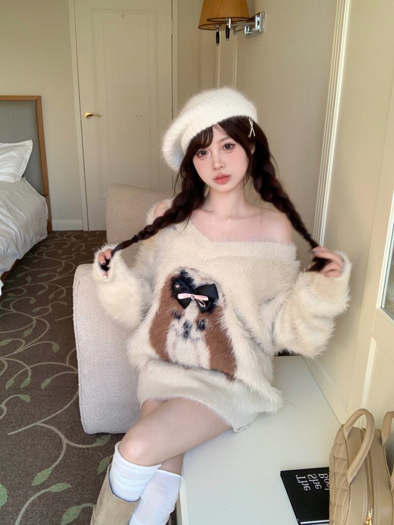 甘いホットガール豪華 V ネックセーター冬子犬プリント肥厚ルーズニットプルオーバートップ 大人ガーリー スウィート キュート カジュアル ウィンター 冬物 Vネック
