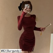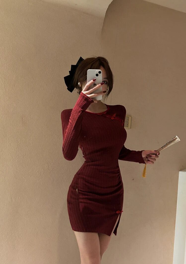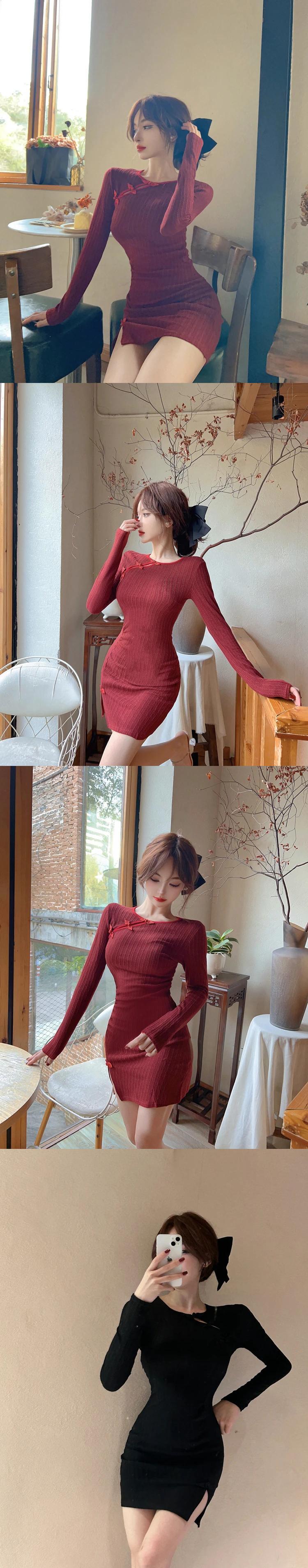中国風甘い女子長袖 O ネックドレス秋スリムフィット尻ラップバックレスドレス ロング 大人ガーリー スウィート キュート カジュアル オータム 秋物 Oネック