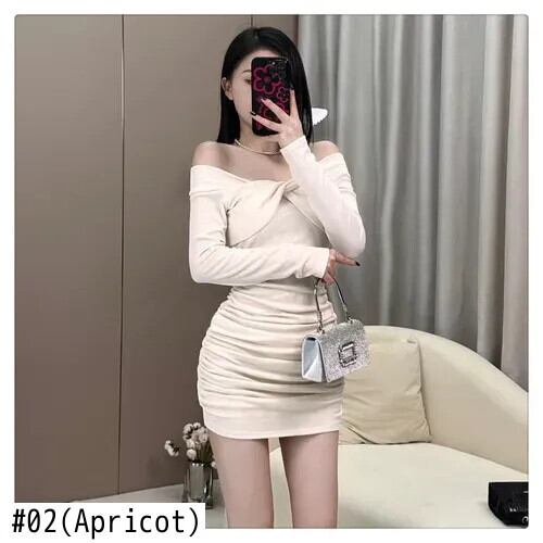 甘いホットガール純粋オフショルダーセクシードレススリムフィット長袖プリーツラップヒップドレス ロング 大人ガーリー スウィート キュート カジュアル ピュア