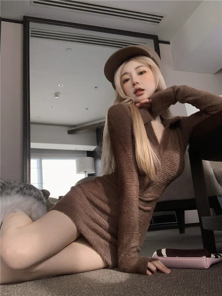 甘い女子純粋セクシー肥厚ニットドレス秋/冬スリムフィット V ネックセクシーラップヒップショートドレス 大人ガーリー スウィート キュート カジュアル オータム 秋物 ウィンター 冬物 Vネック ピュア