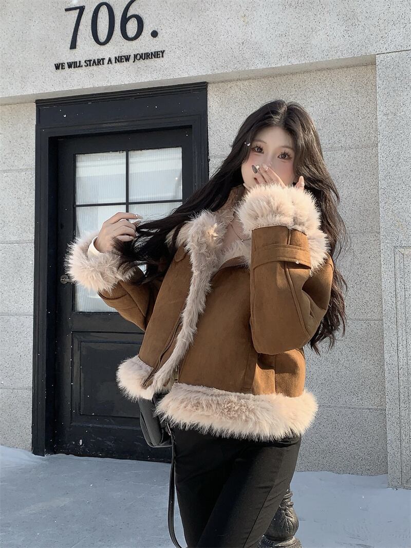 メイラードスタイルホットガールスエードパッチワークショートジャケット冬甘いクール肥厚オートバイコート スウェード 大人ガーリー スウィート キュート カジュアル ウィンター 冬物