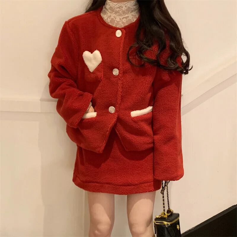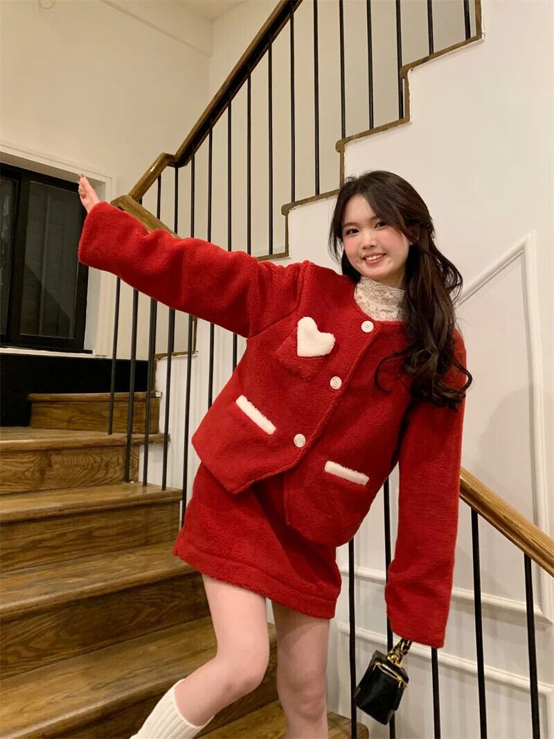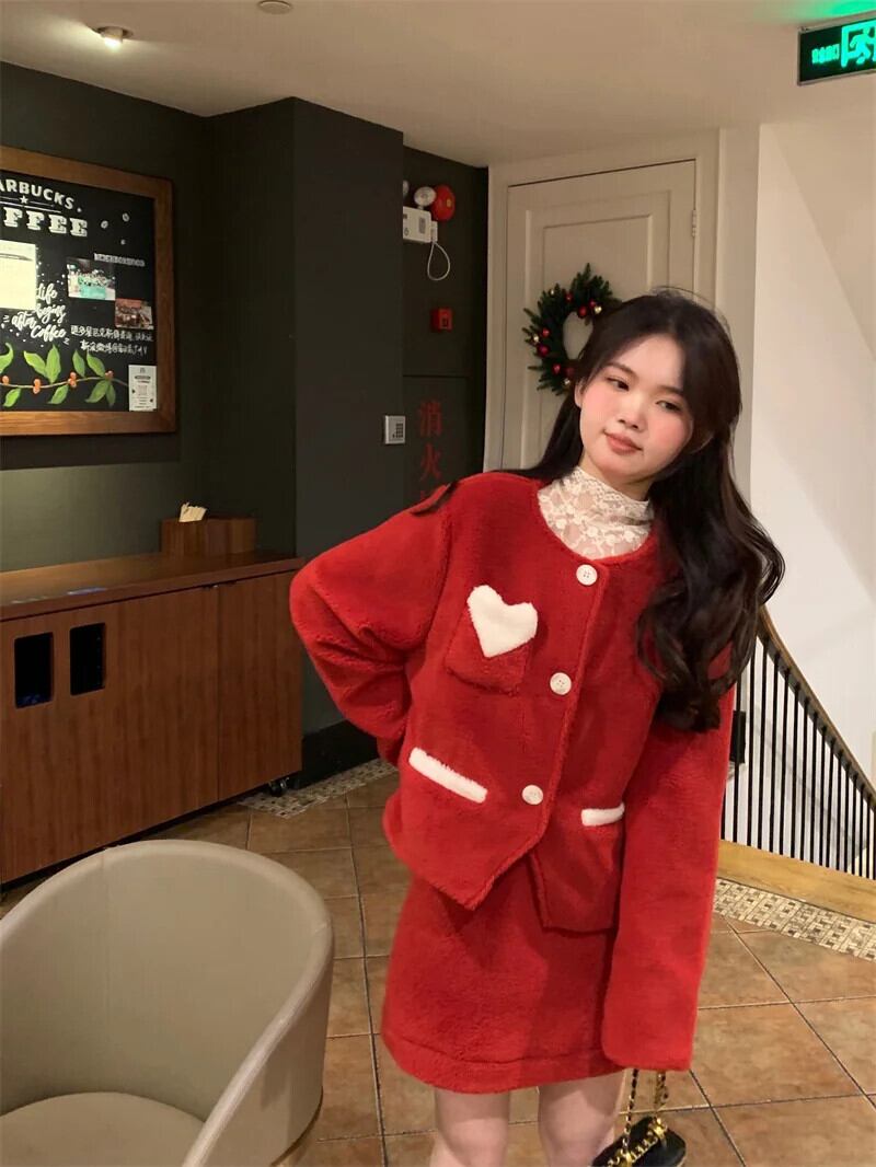 スイートホットガールレッドクリスマススーツ冬ラムヘアコートウエストミニスカートツーピースセット 大人ガーリー スウィート キュート カジュアル ウィンター 冬物