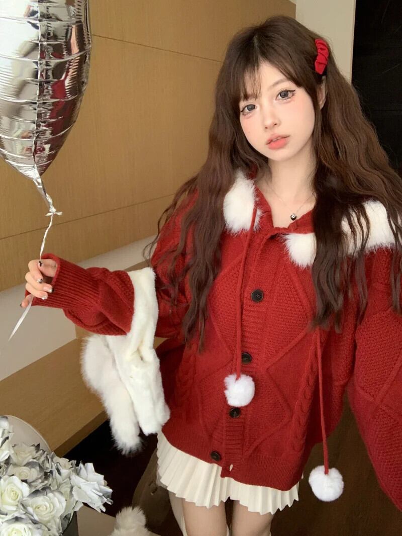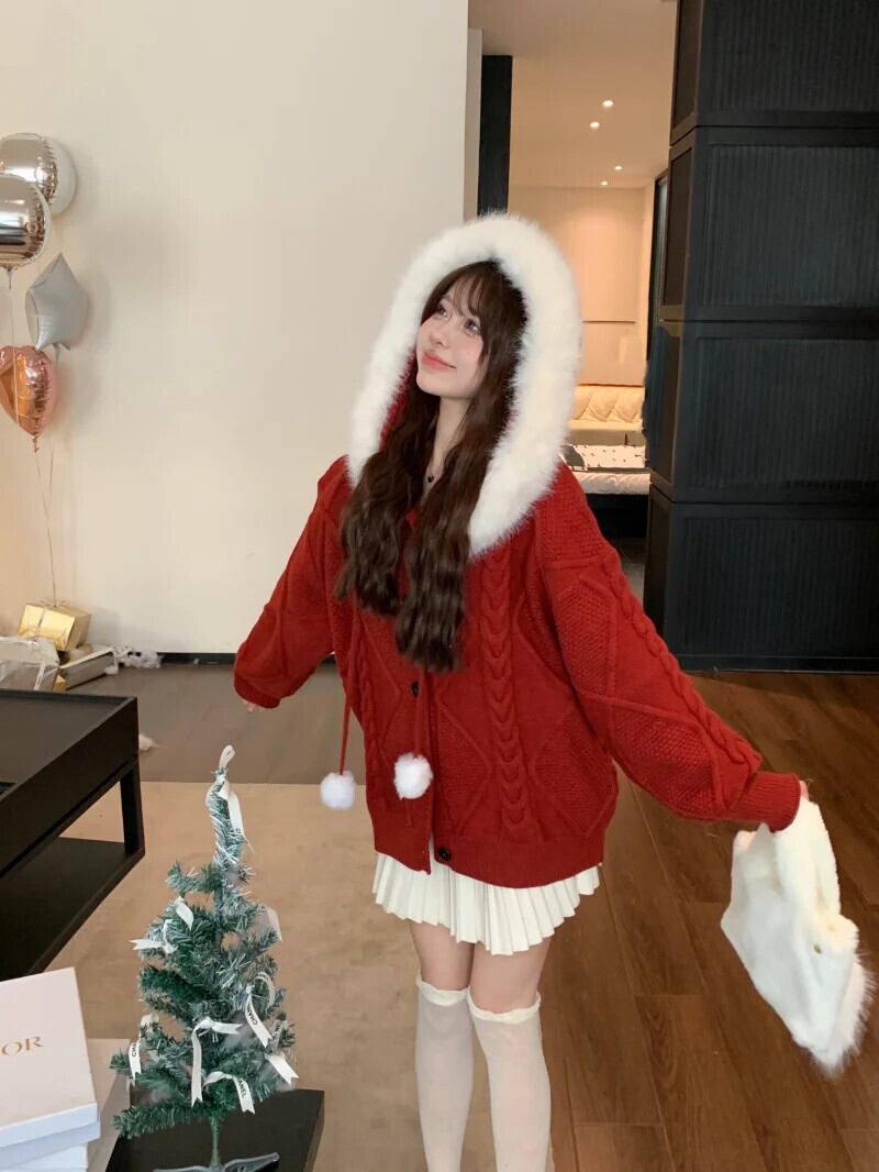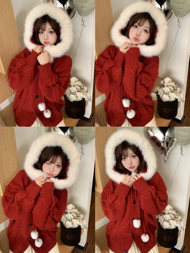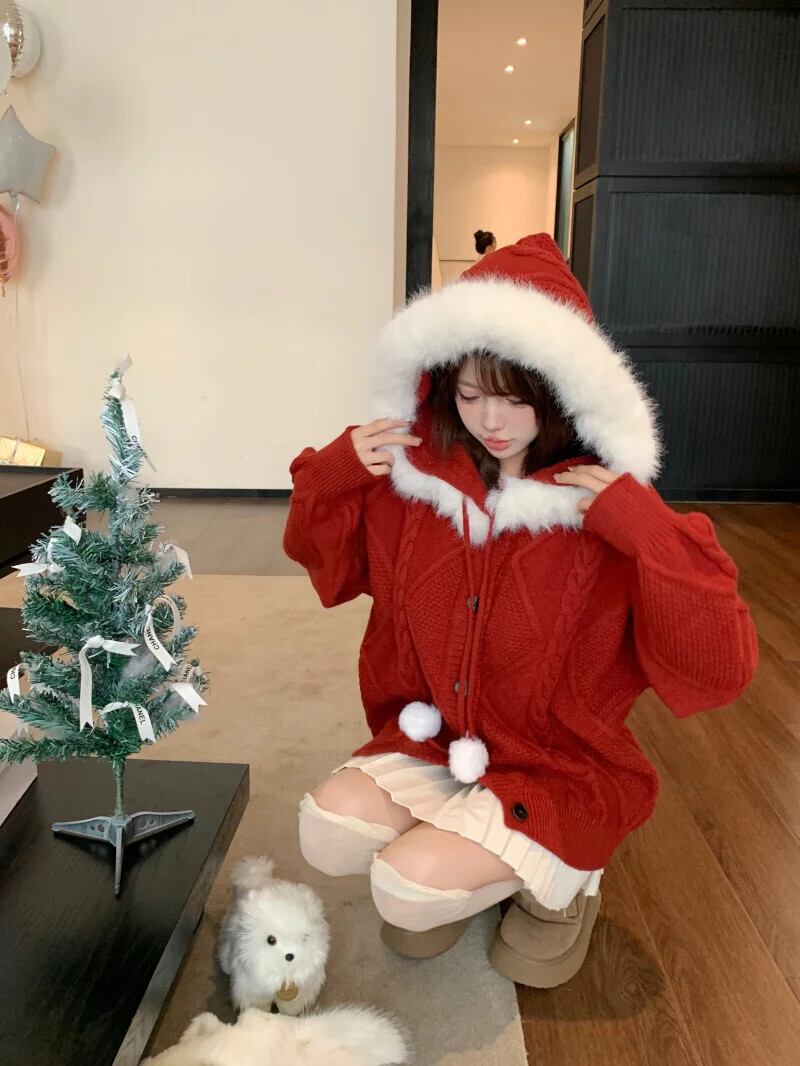 甘いホットガールクリスマス甘いフード付きセーターコート冬ルーズシングルブレストニットカーディガン 大人ガーリー スウィート キュート カジュアル ウィンター 冬物