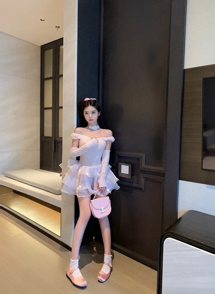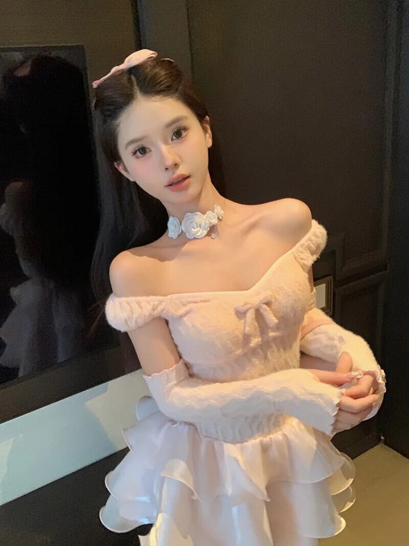 甘いホットガールオフショルダーボウニットドレス冬スラッシュネックスリムフィットメッシュ A ラインショートドレス リボン 大人ガーリー スウィート キュート カジュアル ウィンター 冬物 Aライン