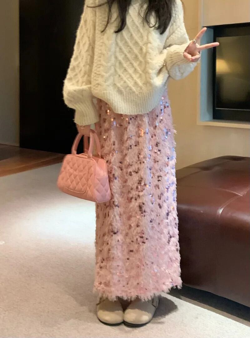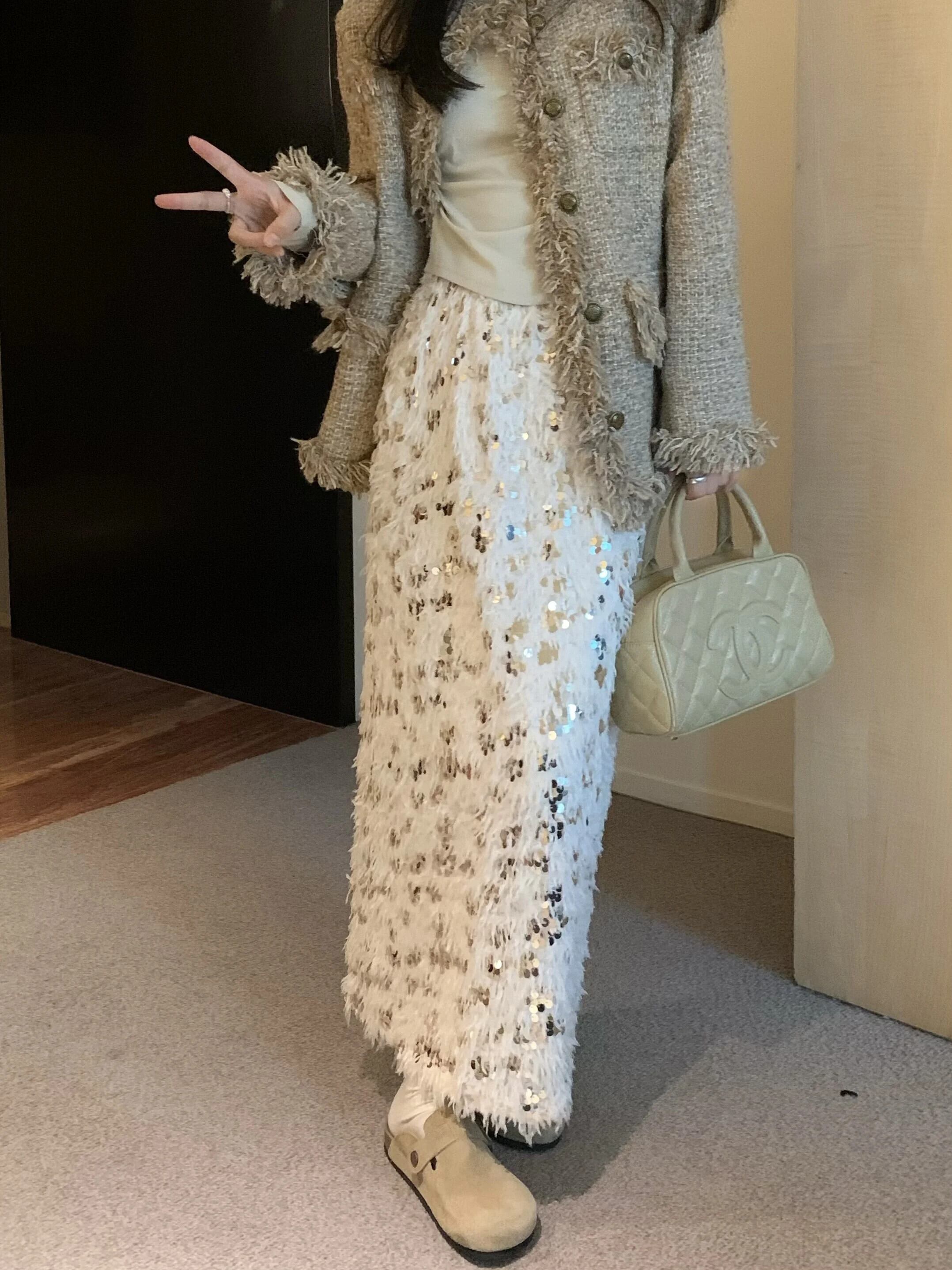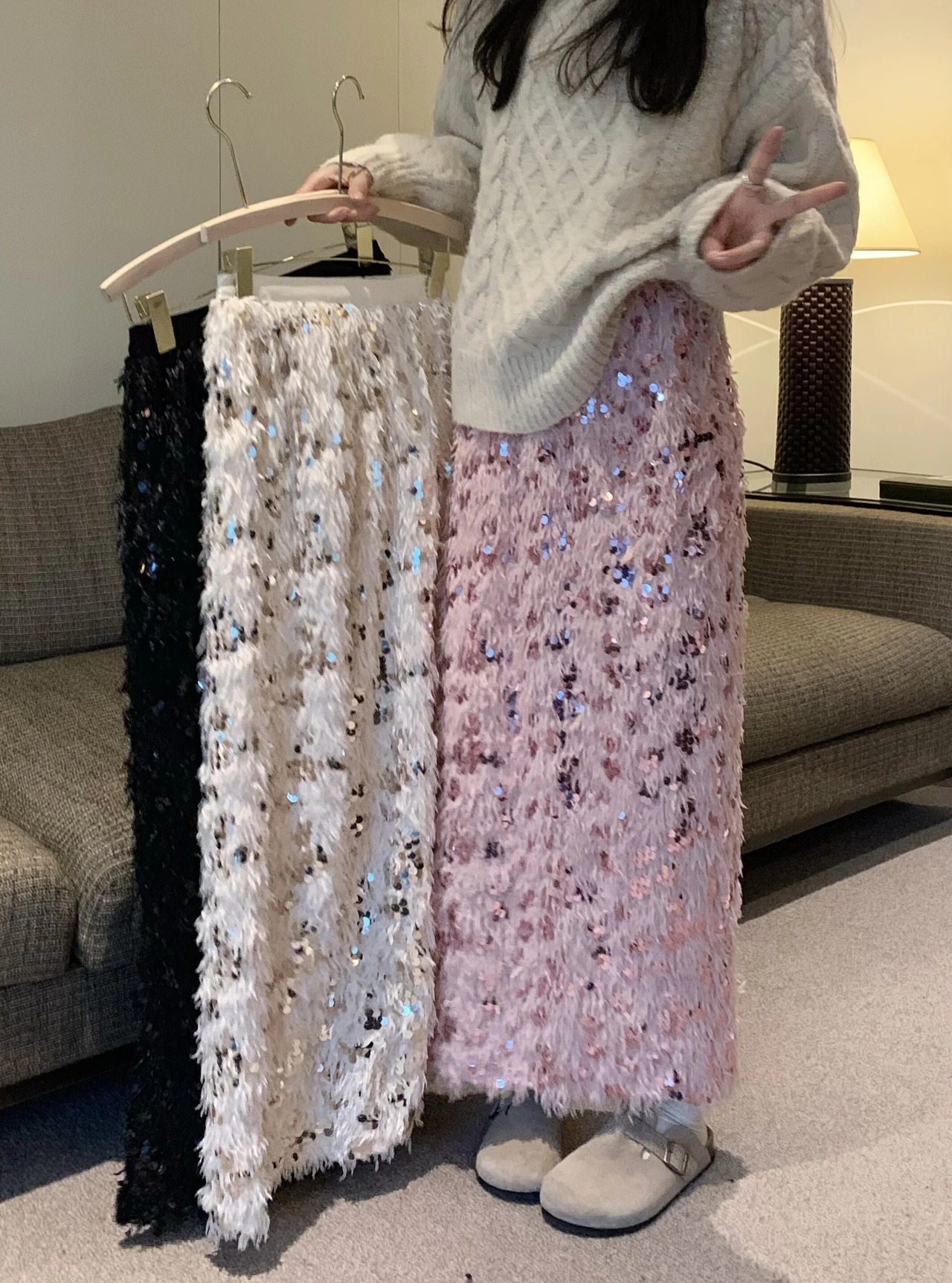 甘いホットガールスパンコール毛皮ようスカート秋/冬ソリッドカラーウエストストレートロングスカート 大人ガーリー スウィート キュート カジュアル オータム 秋物 ウィンター 冬物
