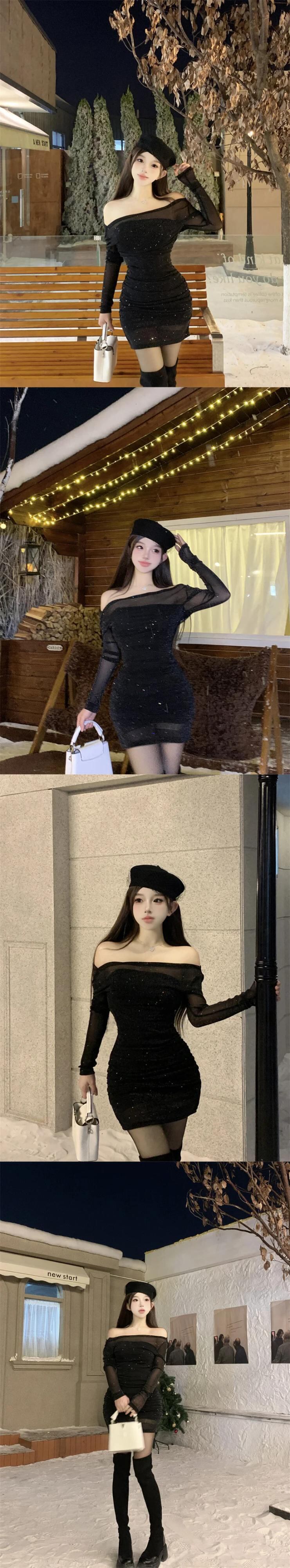 甘いホットガールスパークリングメッシュドレス秋と冬オフショルダーセクシーボトムラップヒップショートドレス 大人ガーリー スウィート キュート カジュアル オータム 秋物 ウィンター 冬物