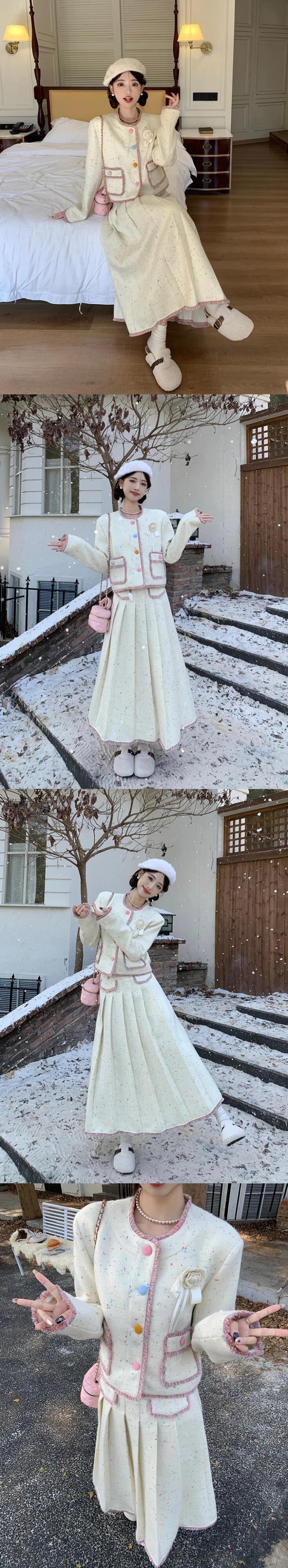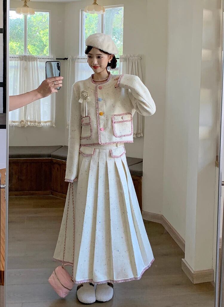 甘いホットガールスーツ秋/冬 O ネックショートウールジャケットプリーツロングスカート 2 点セット 大人ガーリー スウィート キュート カジュアル オータム 秋物 ウィンター 冬物 Oネック