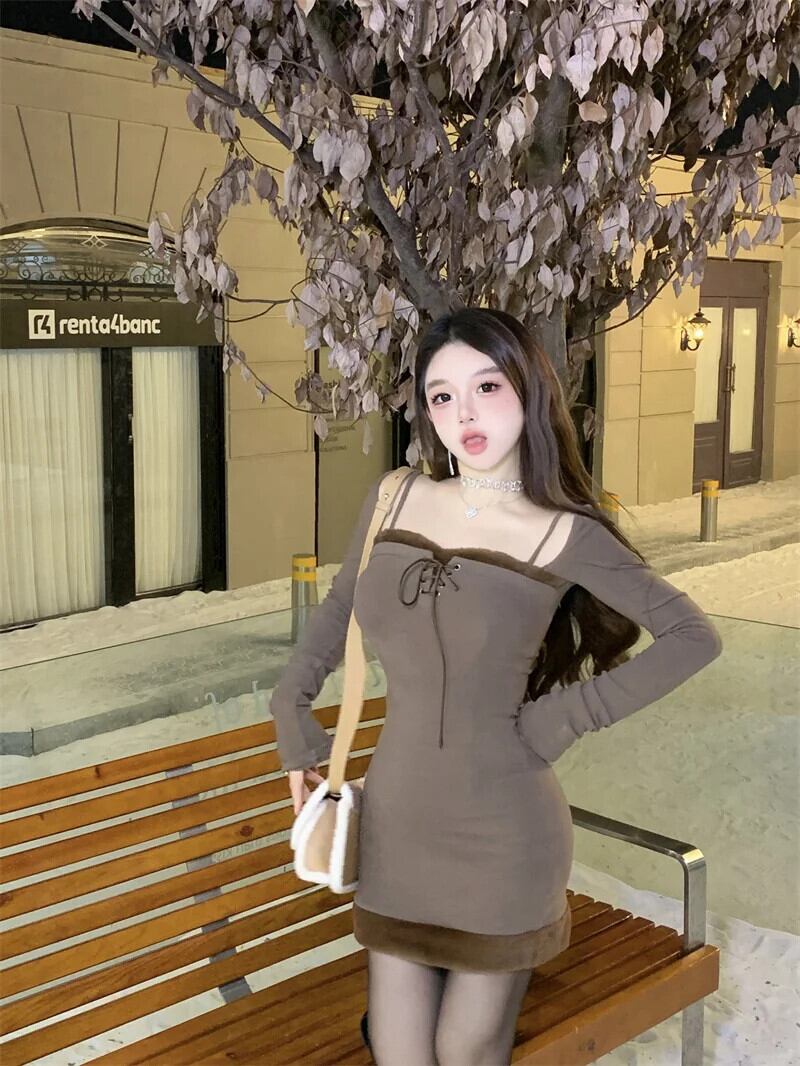 甘いホットガール純粋セクシースリムフィットショートドレス秋/冬スクエアカラーファーパッチワークドレス 大人ガーリー スウィート キュート カジュアル オータム 秋物 ウィンター 冬物 ピュア スクウェア