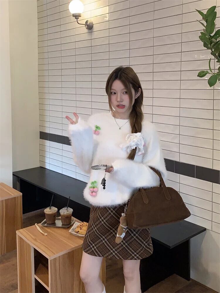 甘いホットガールイミテーションミンクチェリー刺繍セーター秋と冬 O ネックショートニットプルオーバー レッド 大人ガーリー スウィート キュート カジュアル オータム 秋物 ウィンター 冬物 Oネック