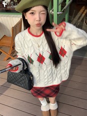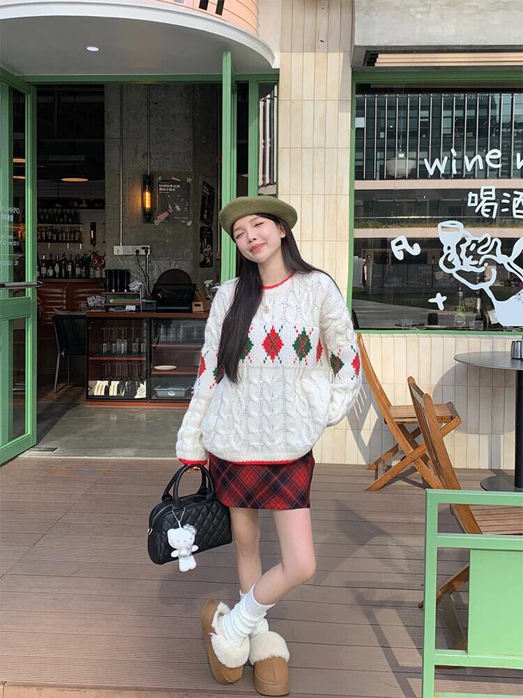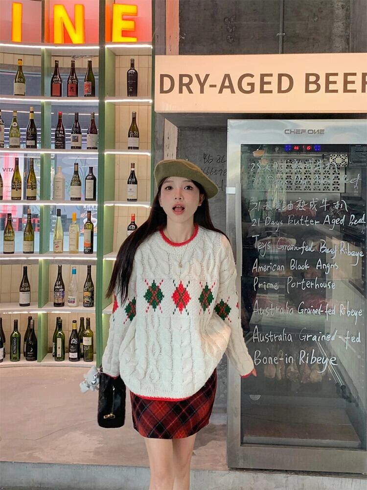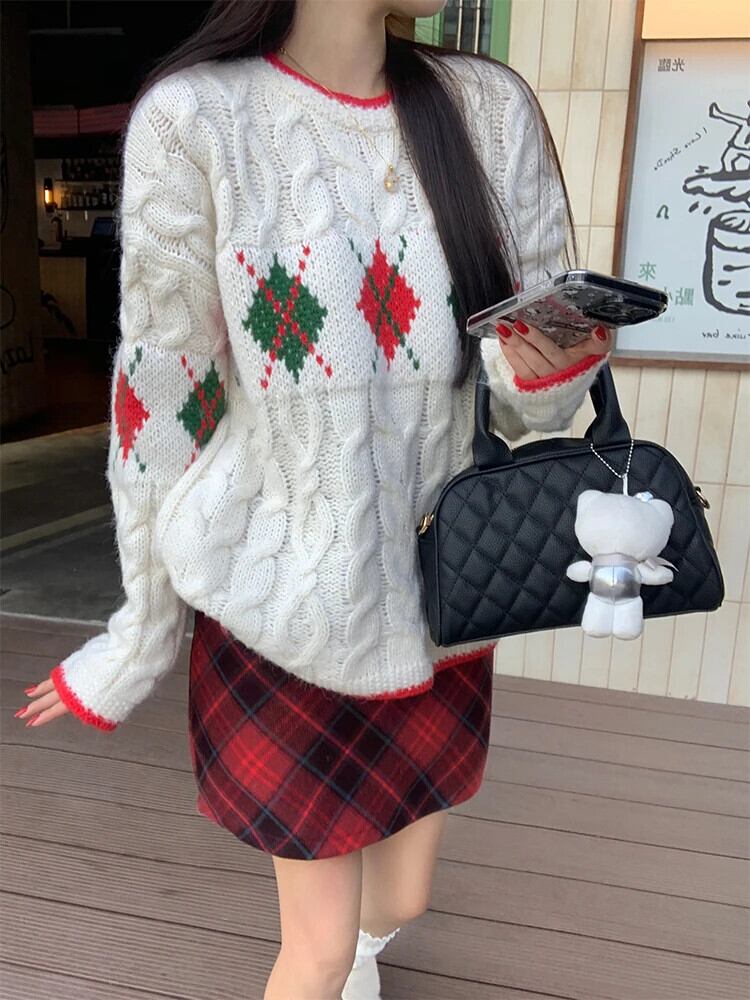 甘いホットガールクリスマスツイストセーター冬長袖レトロ O ネックルーズニットプルオーバー ロング 大人ガーリー スウィート キュート カジュアル ウィンター 冬物 Oネック