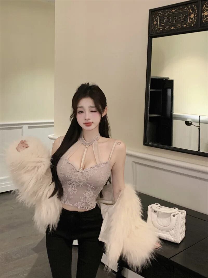 甘いホットガールレースセクシーホルターネックキャミソール秋スリムフィットメッシュ底ストラップショートトップ 大人ガーリー スウィート キュート カジュアル オータム 秋物