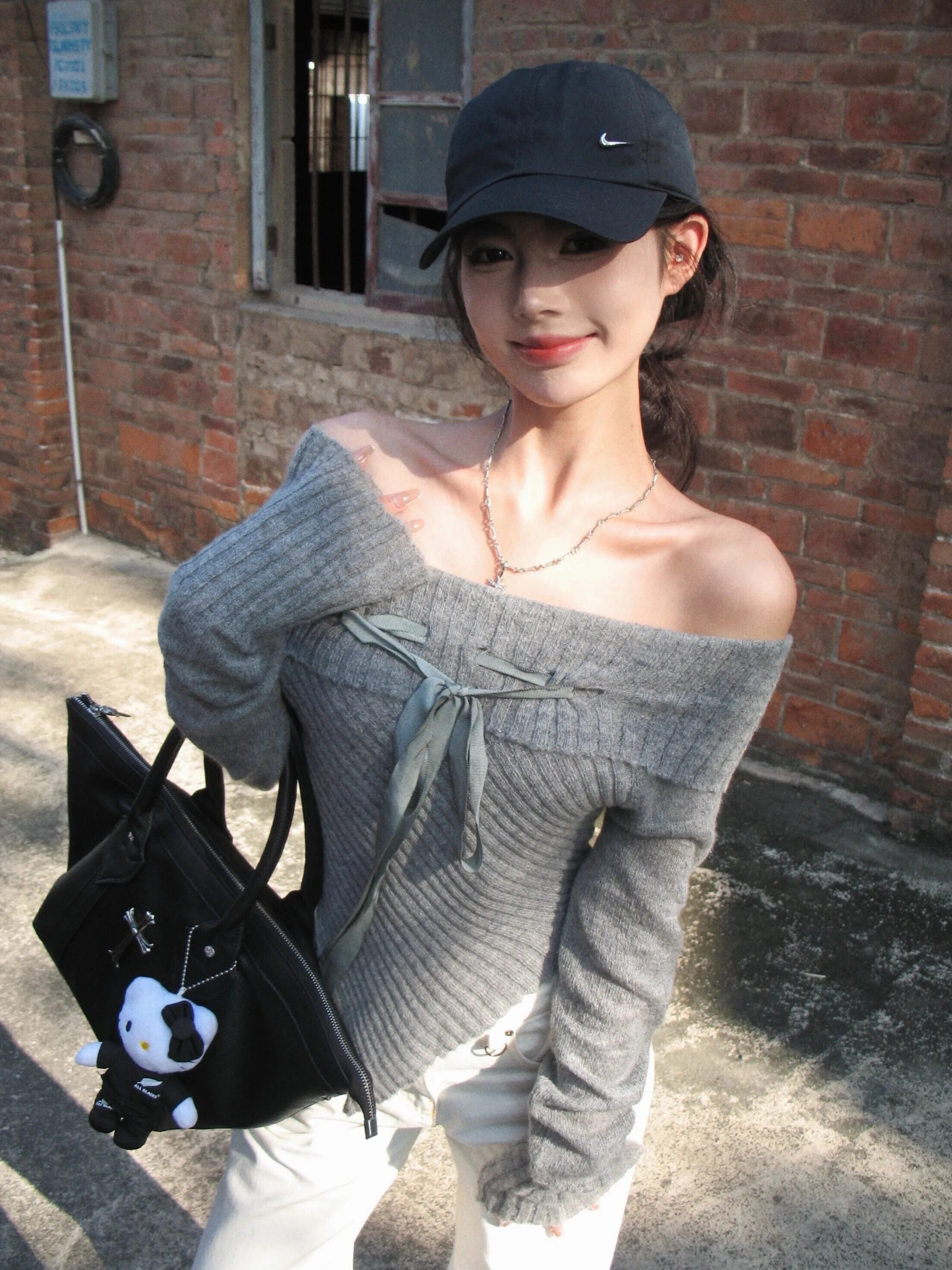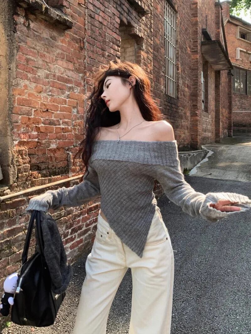 Sweet Girl リボンレースアップセーター冬不規則スリムフィットオフショルダーニットプルオーバートップ 大人ガーリー スウィート キュート カジュアル ウィンター 冬物