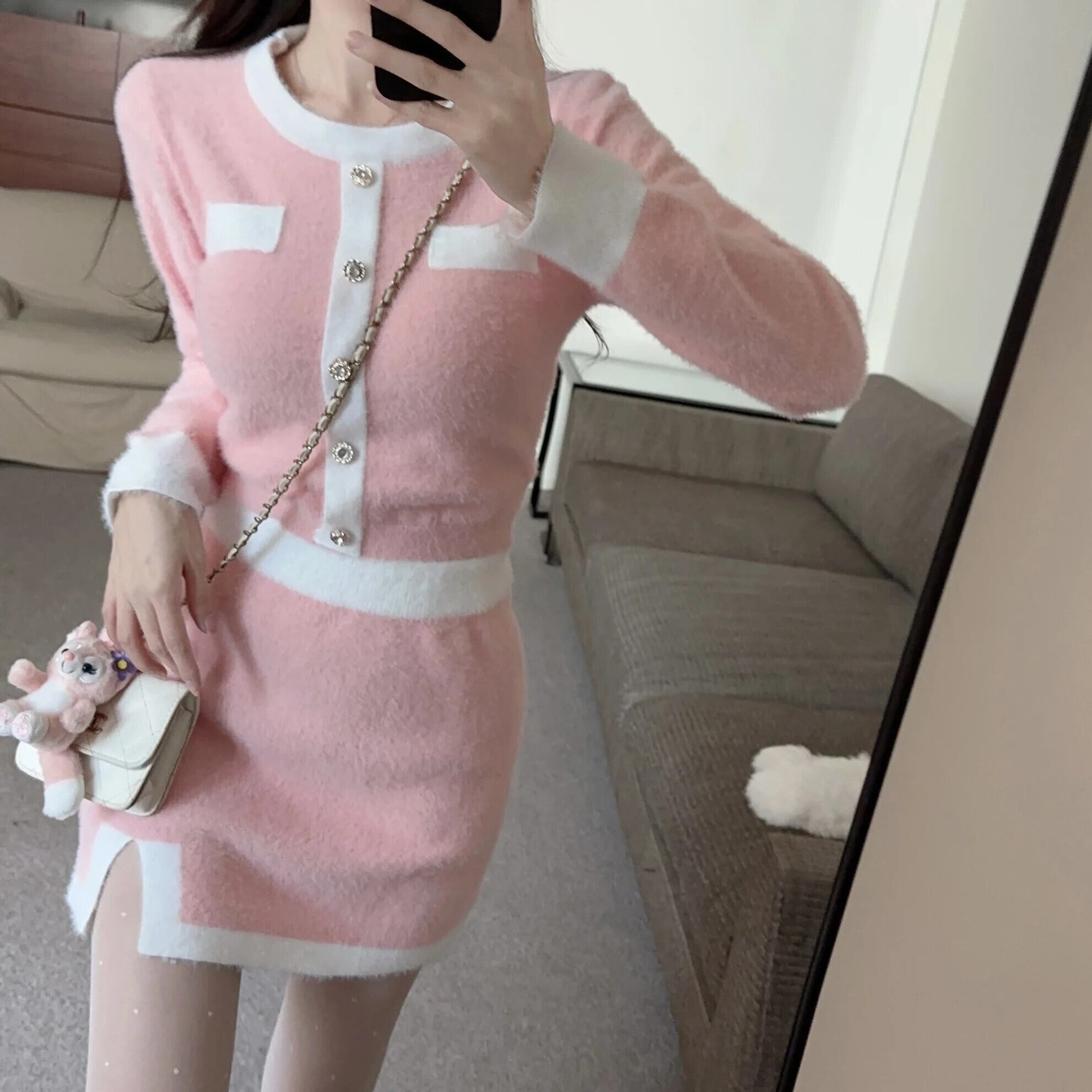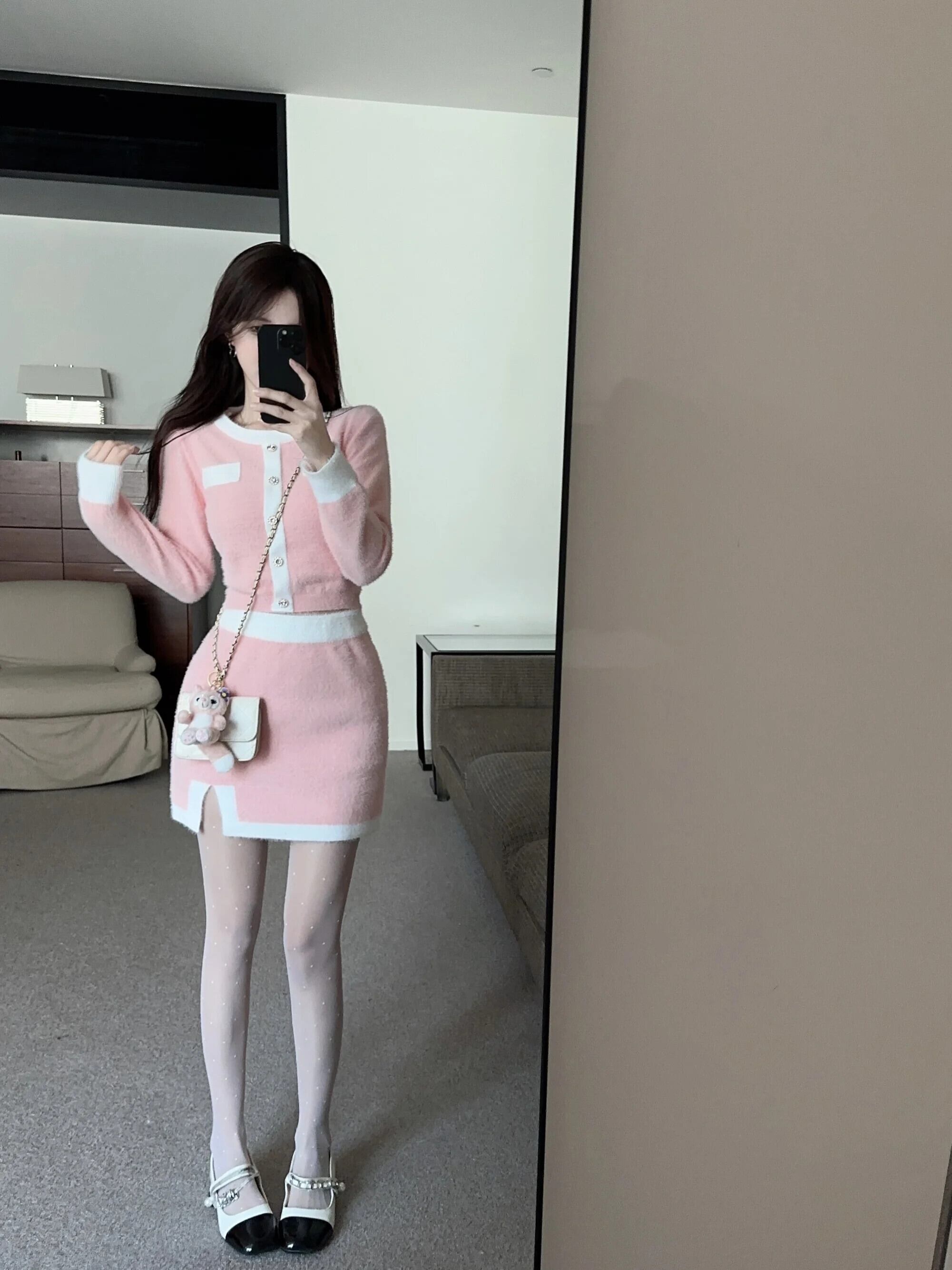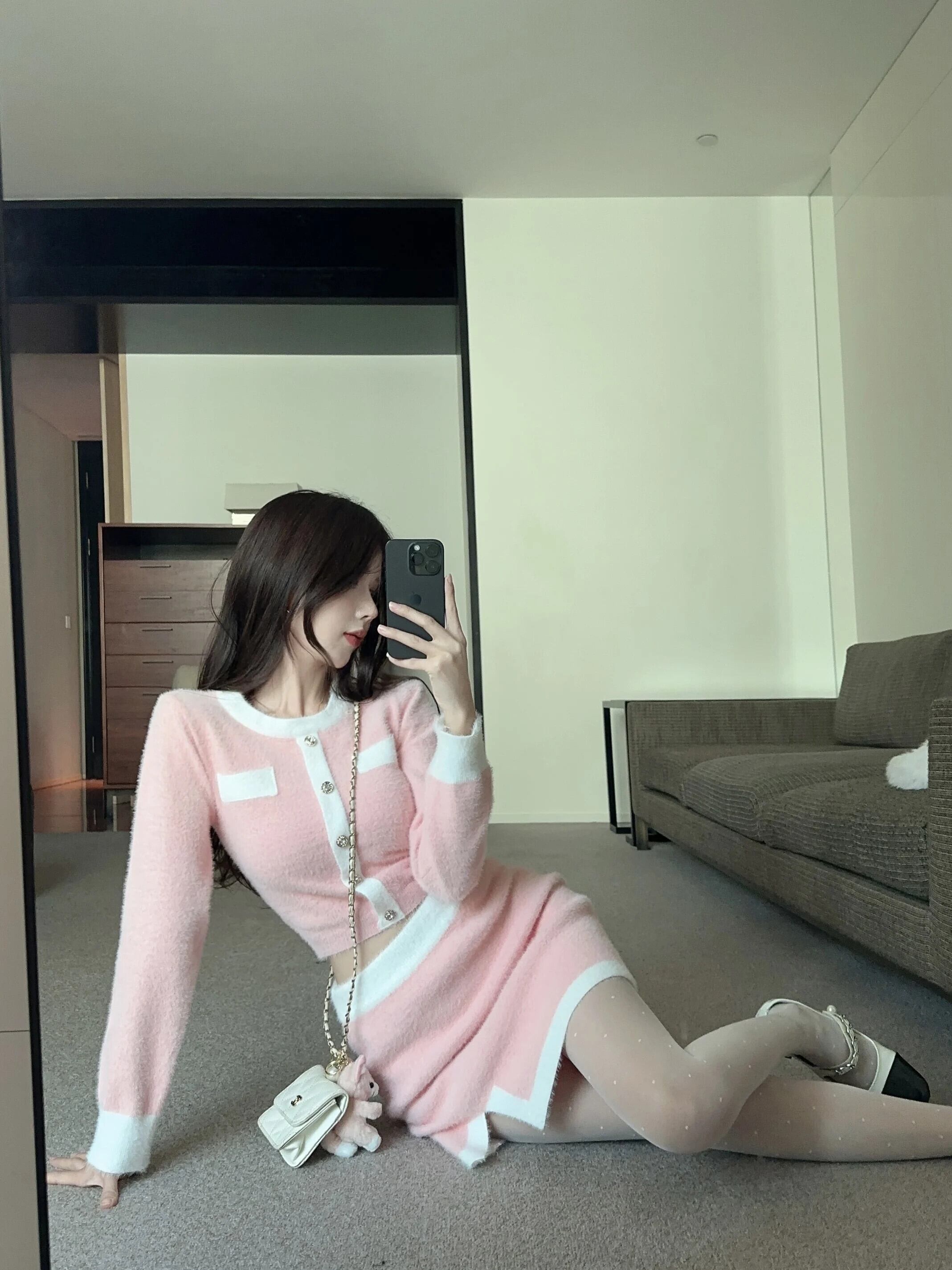 Sweet Girl ピンクスーツ秋長袖 O ネックショートカーディガンラップヒップミニスカート 2 点セット ロング 大人ガーリー スウィート キュート カジュアル オータム 秋物 Oネック