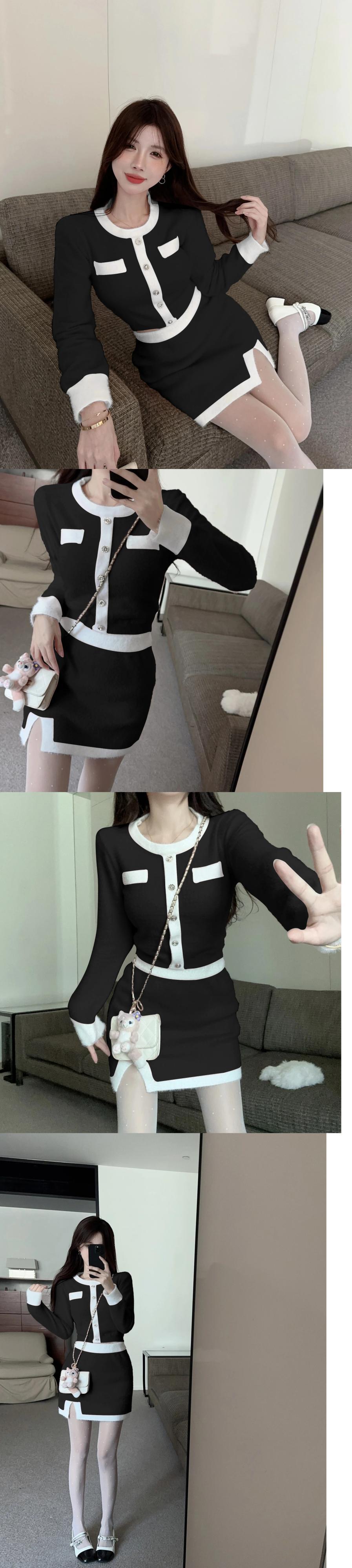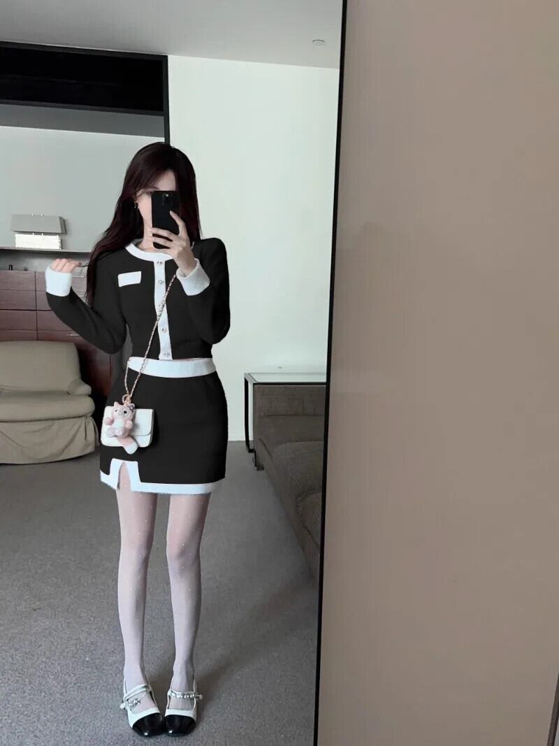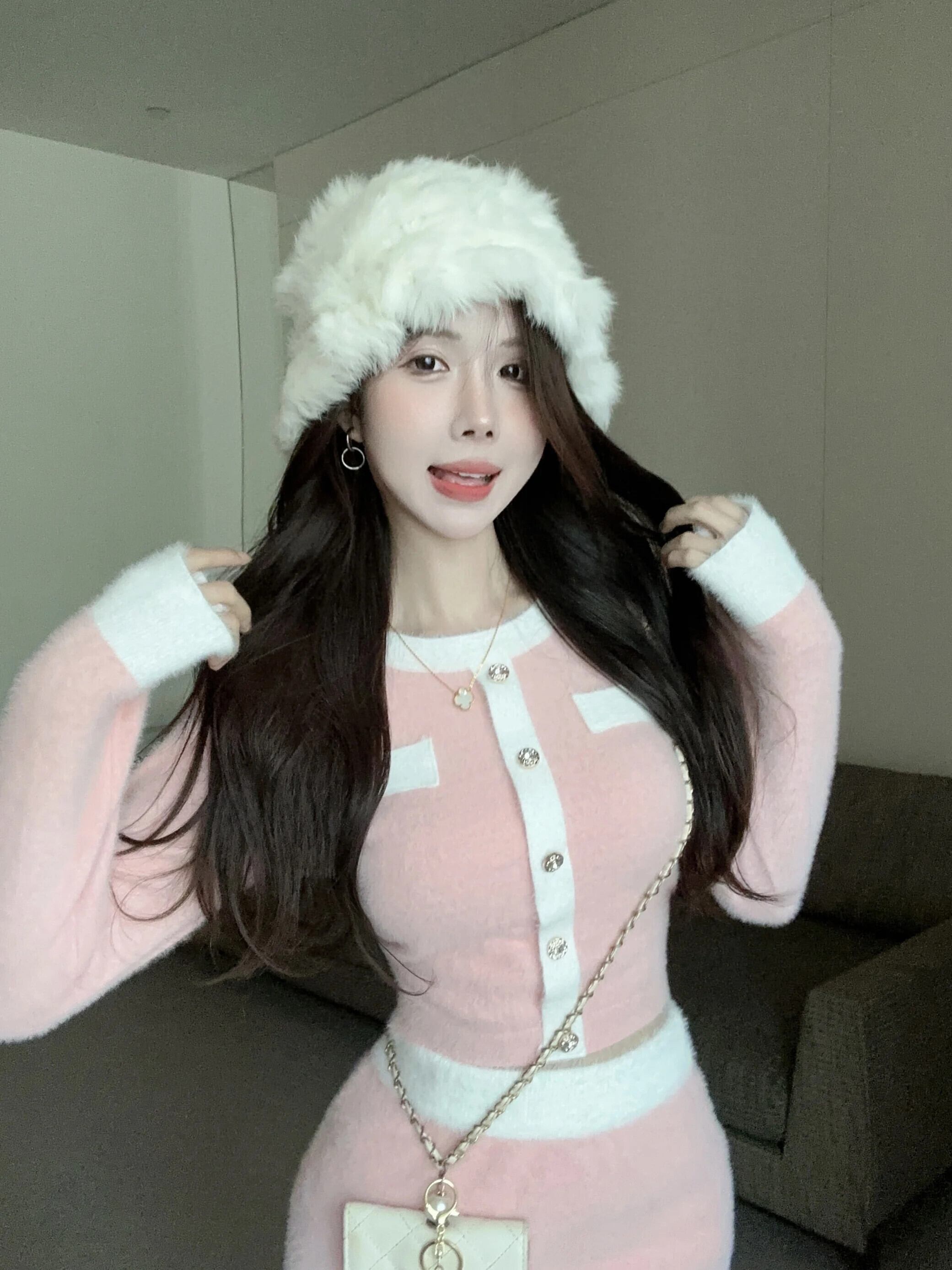 Sweet Girl ピンクスーツ秋長袖 O ネックショートカーディガンラップヒップミニスカート 2 点セット ロング 大人ガーリー スウィート キュート カジュアル オータム 秋物 Oネック