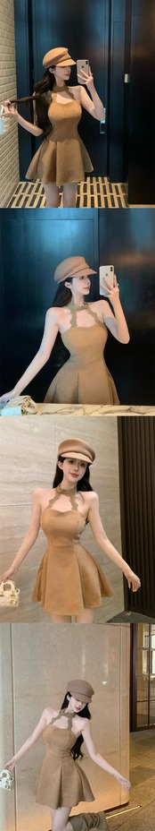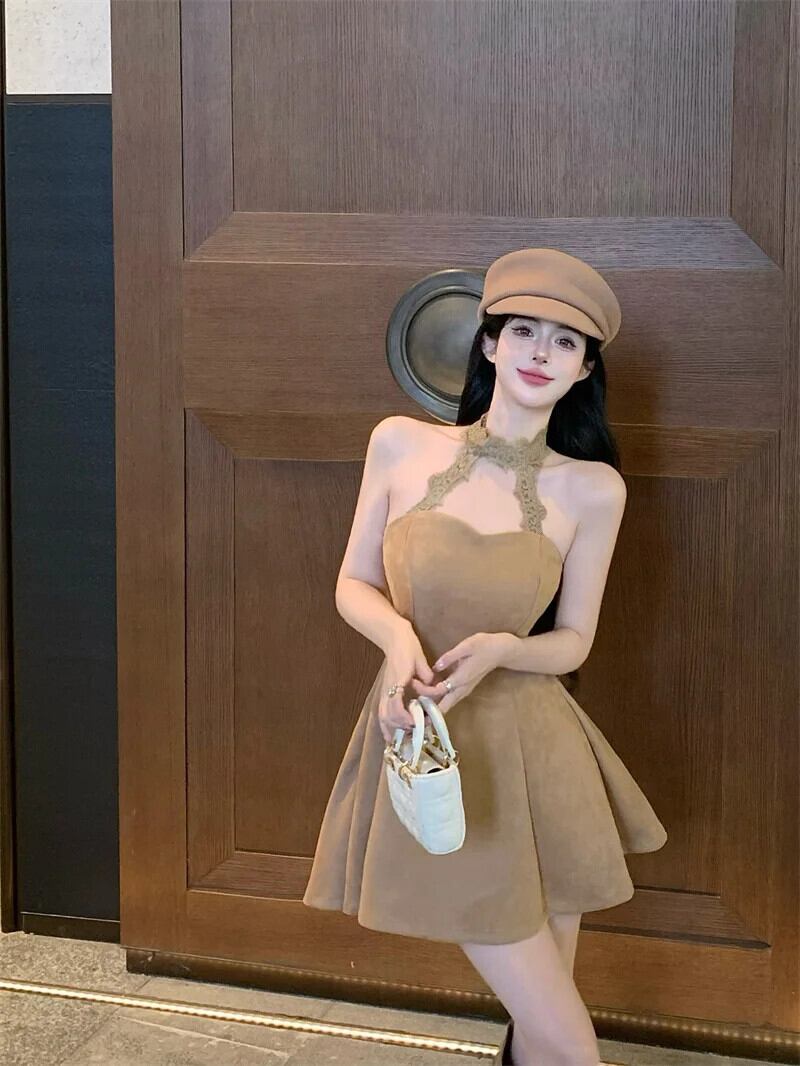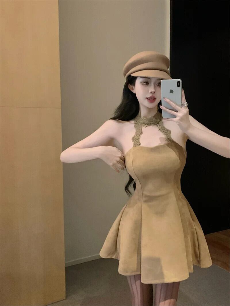 純粋セクシー甘いホットガールホルターネックベルベットドレス秋スリムフィットレーススプライス A ラインショートドレス 大人ガーリー スウィート キュート カジュアル オータム 秋物 Aライン