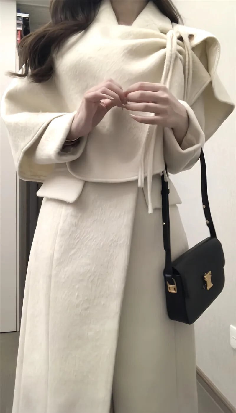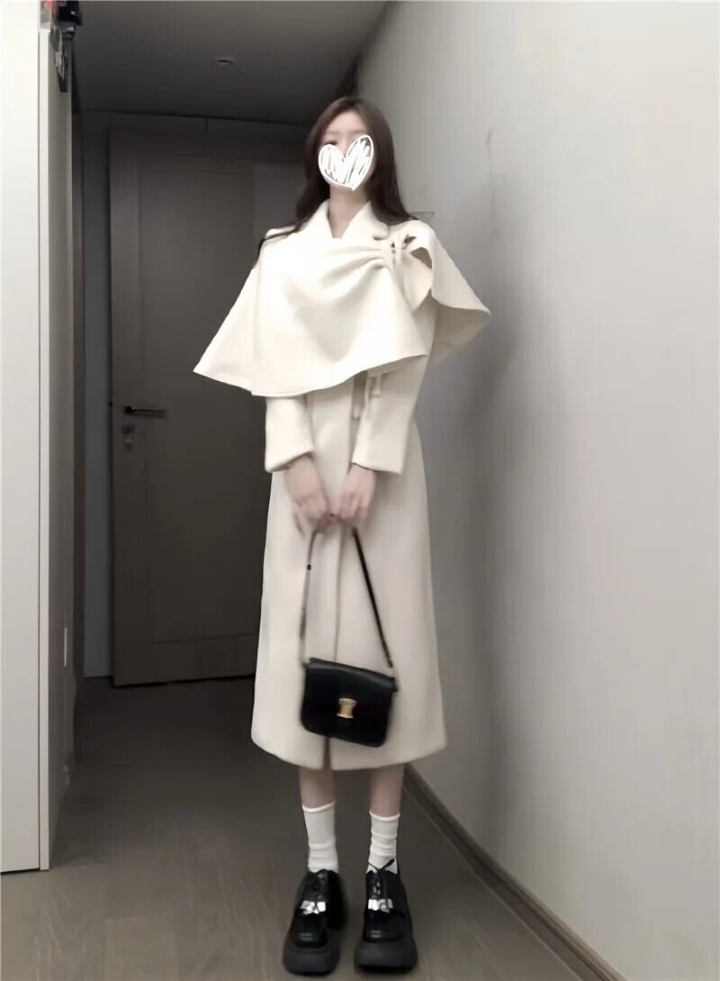 Sweet Girl ホワイトウールコート秋/冬取り外し可能ショールミッドレングスダブルブレストコート 大人ガーリー スウィート キュート カジュアル オータム 秋物 ウィンター 冬物