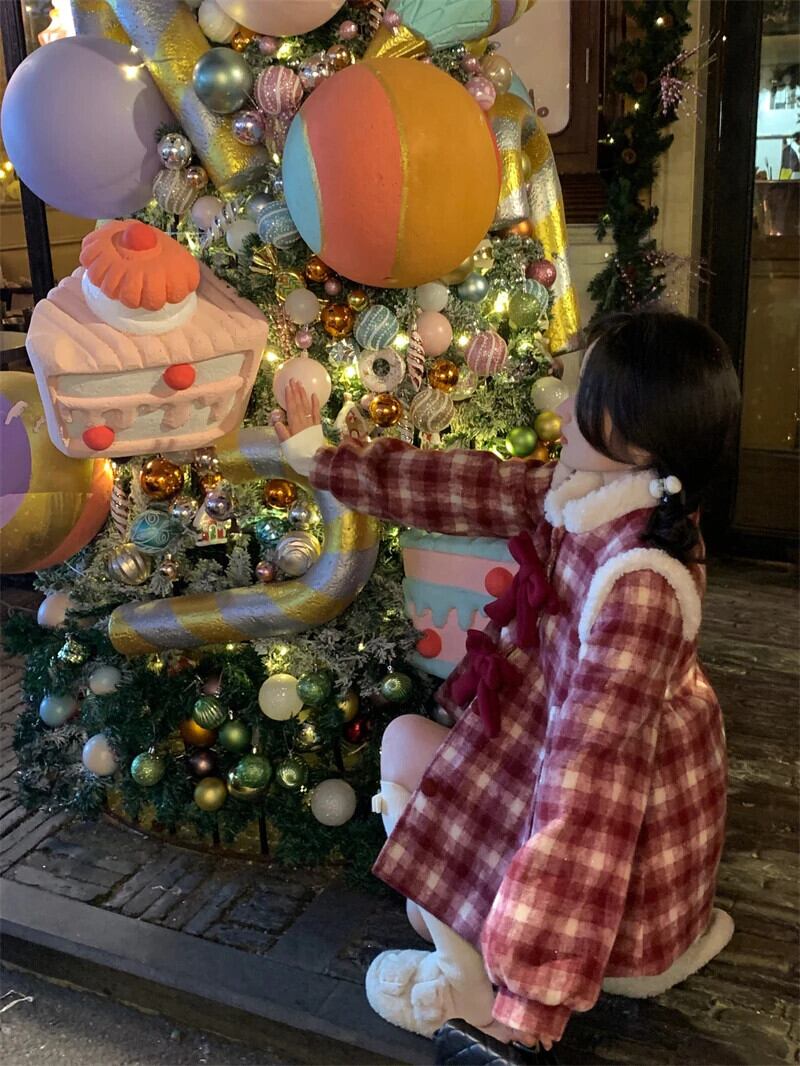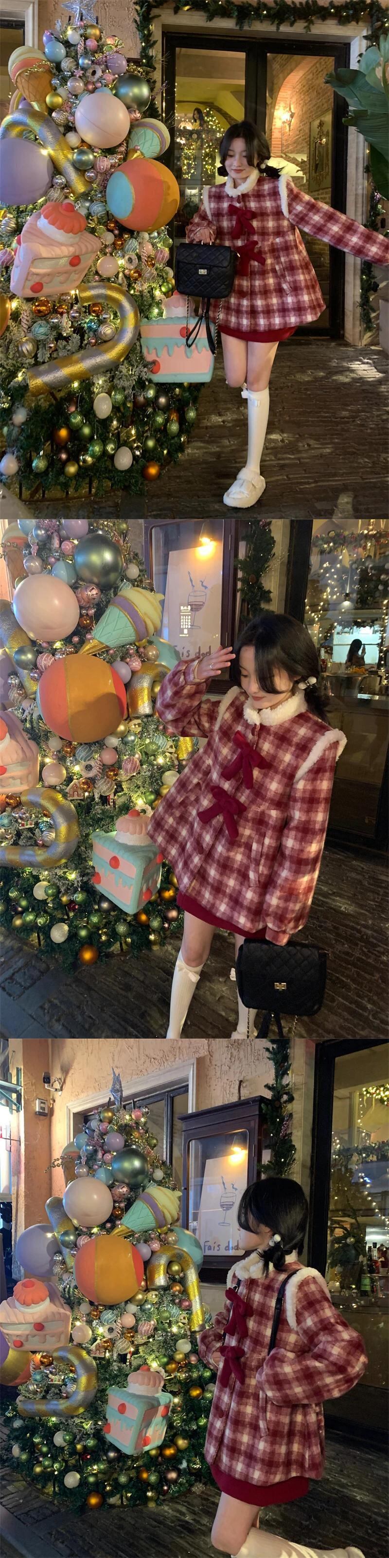 甘いホットガールクリスマスチェック柄コットンウールジャケット冬長袖リボン O ネックルーズコート ロング 大人ガーリー スウィート キュート カジュアル ウィンター 冬物 Oネック