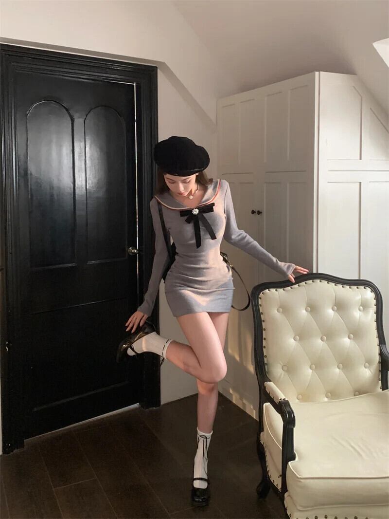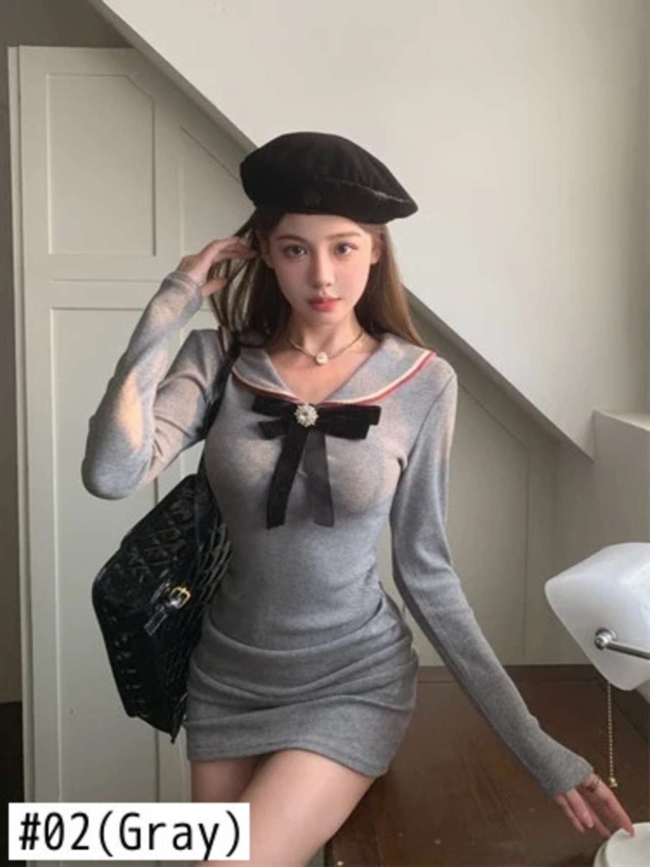フレンチスイートガールドレス秋/冬スリムフィットボウタイセーラー襟ニット長袖ラップヒップドレス ロング リボン 大人ガーリー スウィート キュート カジュアル オータム 秋物 ウィンター 冬物