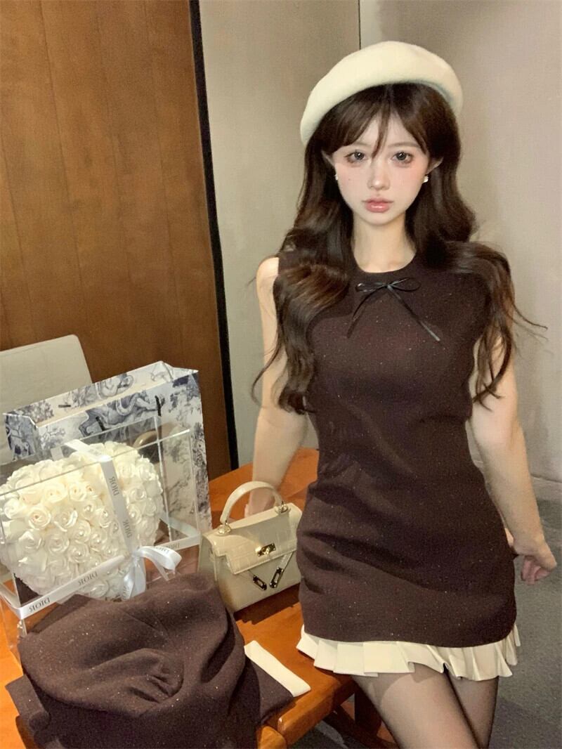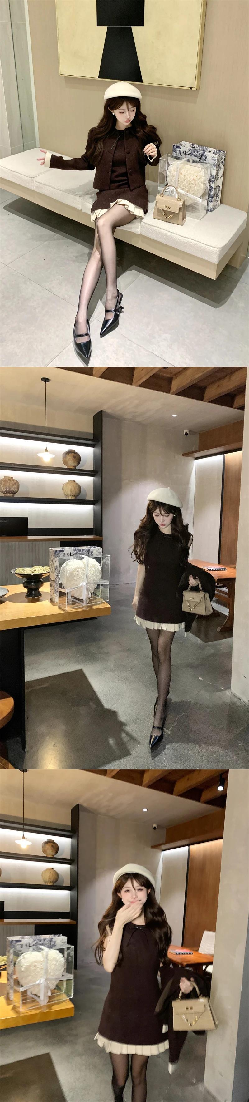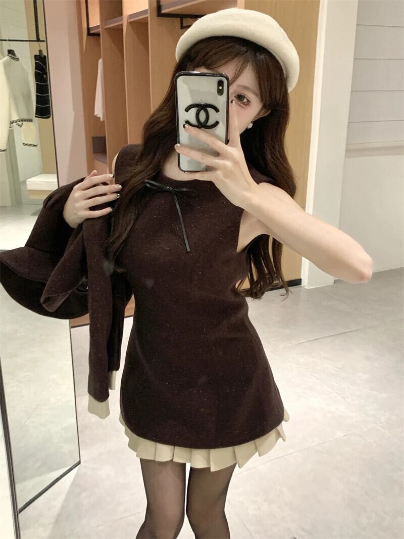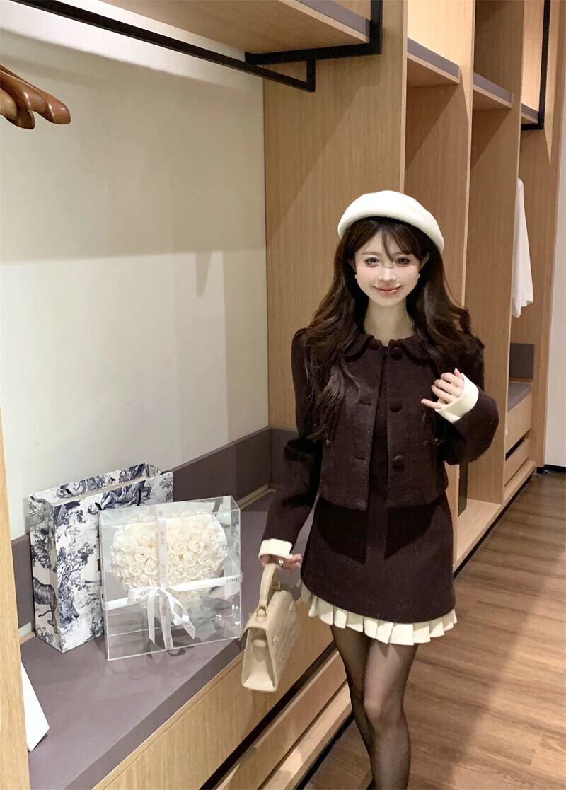 甘いホットガールスーツ秋/冬ターンダウン襟ウールコートストラップショートドレスツーピースセット 大人ガーリー スウィート キュート カジュアル オータム 秋物 ウィンター 冬物