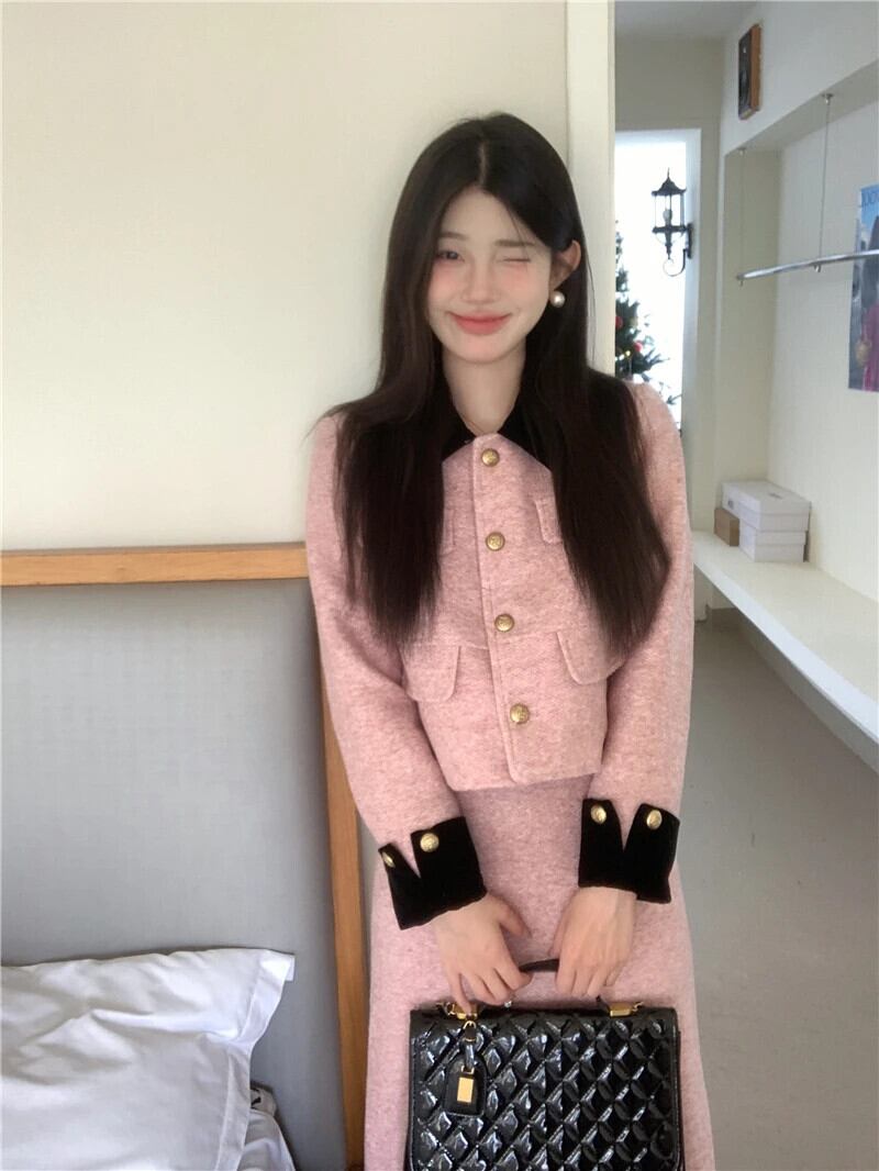 甘いホットガールスーツ冬対照的ラペルファー肥厚コートウエストスカートツーピースセット 大人ガーリー スウィート キュート カジュアル ウィンター 冬物