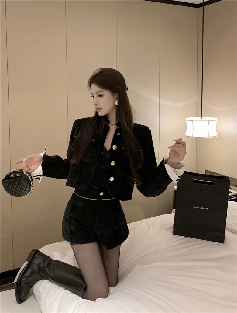 甘いホットガールレトロスーツ冬綿パッチワークカラージャケットウエストショーツ 2 点セット コットン 大人ガーリー スウィート キュート カジュアル ウィンター 冬物 ブルマー