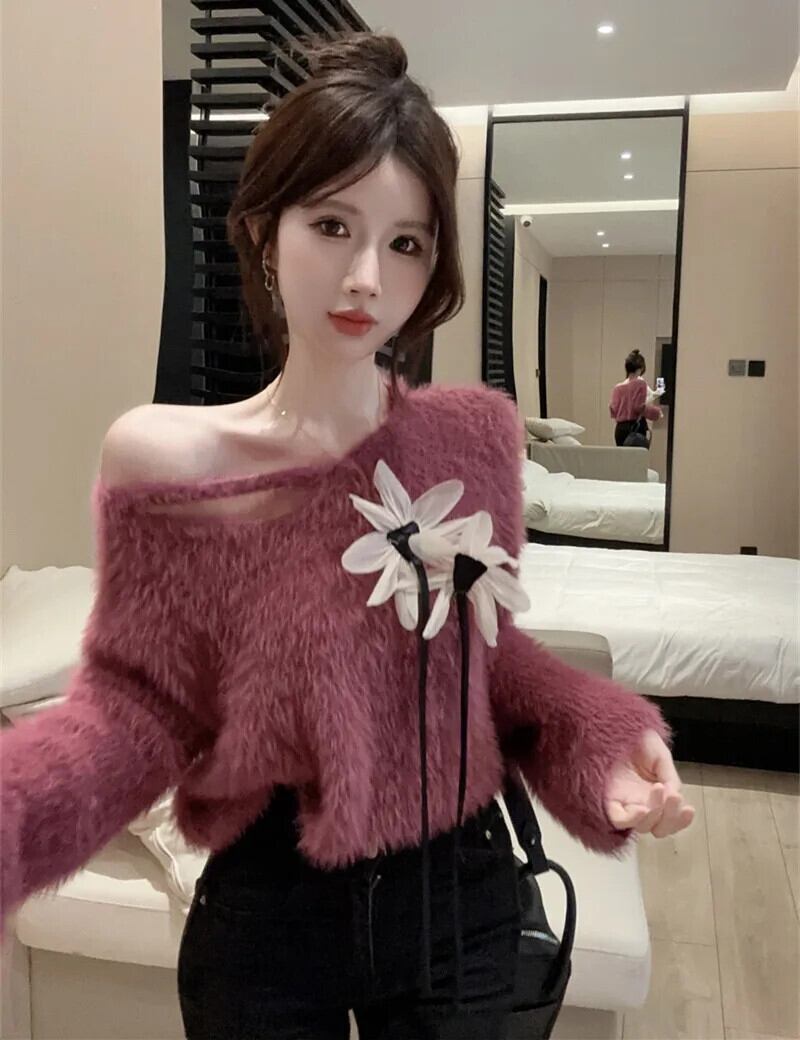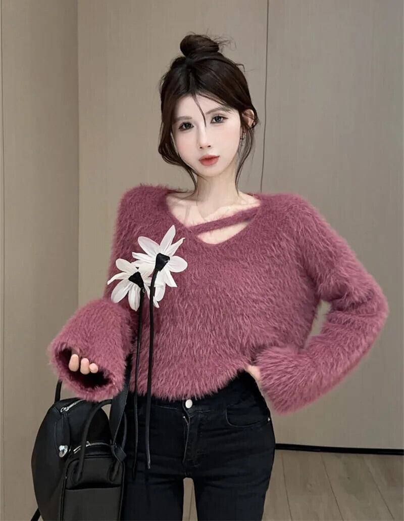 スイートガールフラワーぬいぐるみセーター秋/冬長袖 V ネックショートニットプルオーバー ロング 大人ガーリー スウィート キュート カジュアル オータム 秋物 ウィンター 冬物 Vネック フラワーデザイン