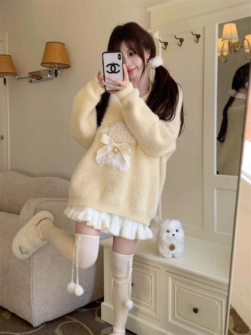甘いホットガールスーツ秋/冬 V ネックラムプリントセーター A ラインミニスカート 2 点セット 大人ガーリー スウィート キュート カジュアル オータム 秋物 ウィンター 冬物 Vネック Aライン