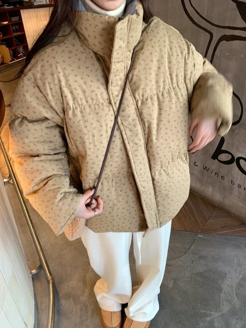 甘いホットガールフラワープリントコットンコート冬厚くて暖かいスタンドカラールーズコート 大人ガーリー スウィート キュート カジュアル ウィンター 冬物 フラワーデザイン