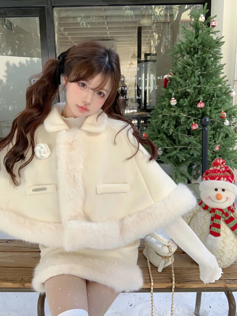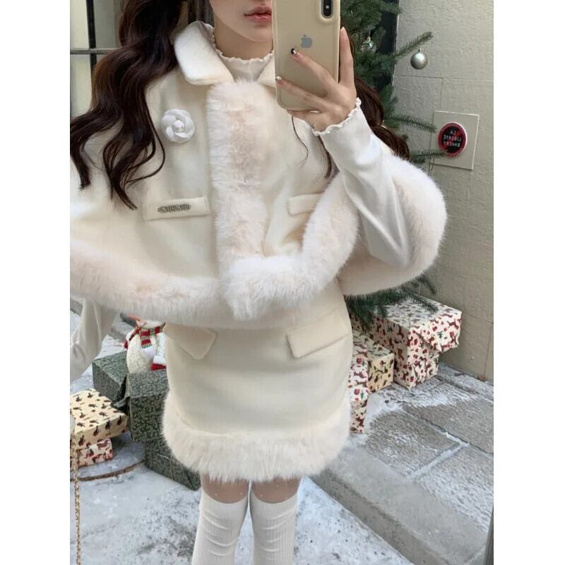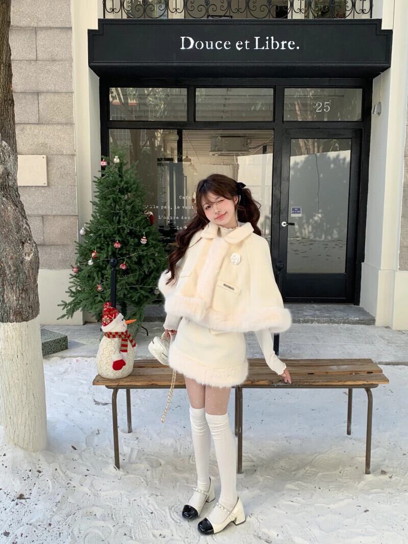 甘いホットガールクリスマス白スーツ秋と冬毛皮ようケープジャケットウエストラップヒップスカート 2 点セット ホワイト 大人ガーリー スウィート キュート カジュアル オータム 秋物 ウィンター 冬物