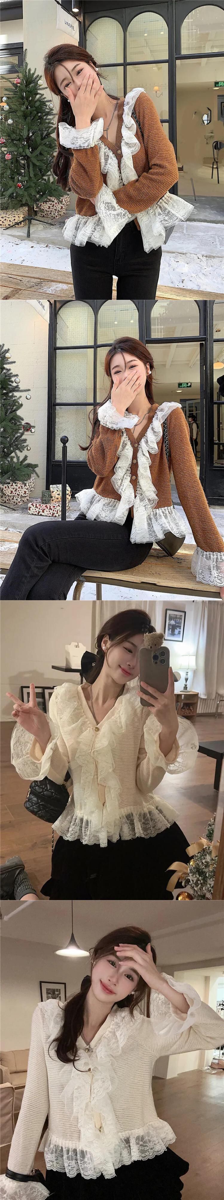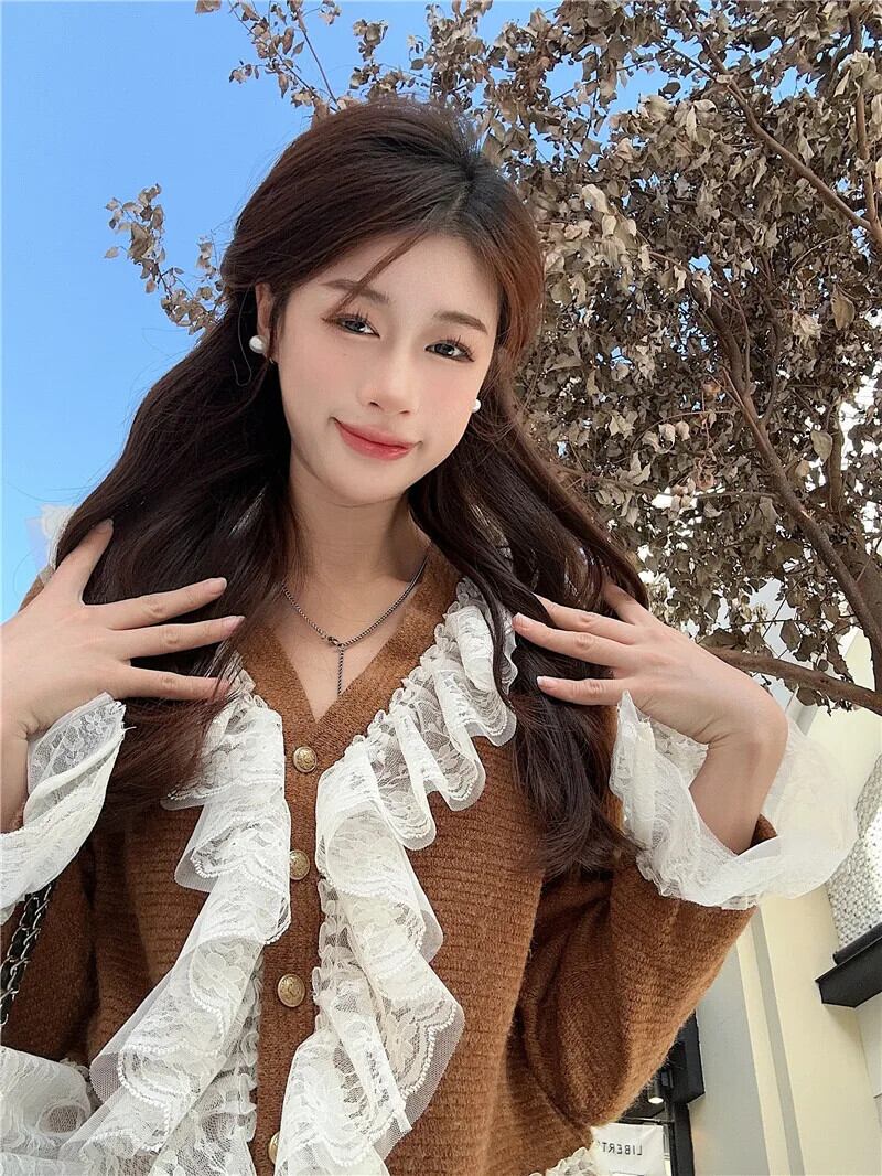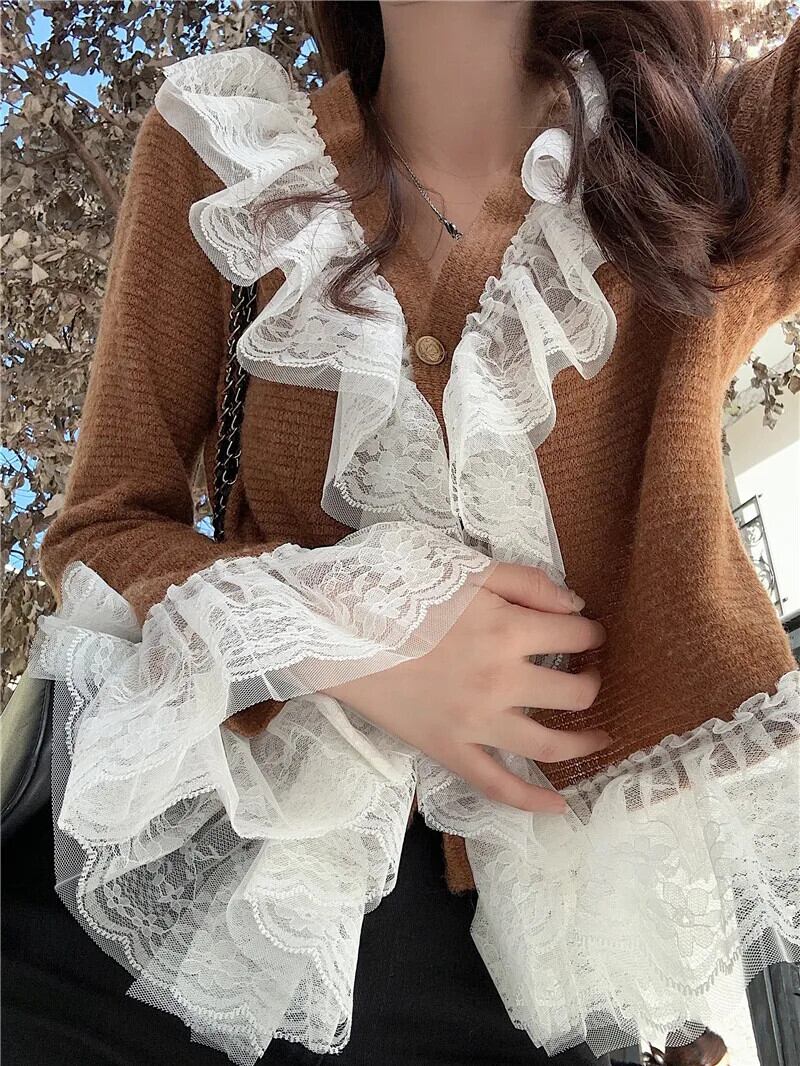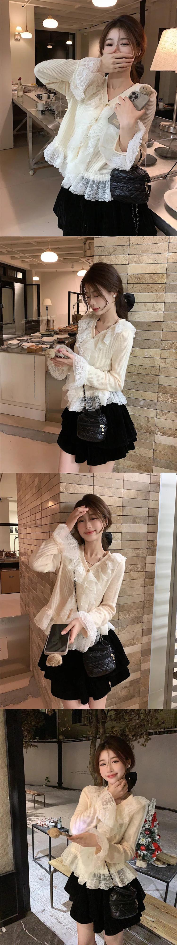 甘いホットガール V ネックレースニットカーディガン秋/冬スリムフィットショートフレアスリーブセーター 大人ガーリー スウィート キュート カジュアル オータム 秋物 ウィンター 冬物 Vネック