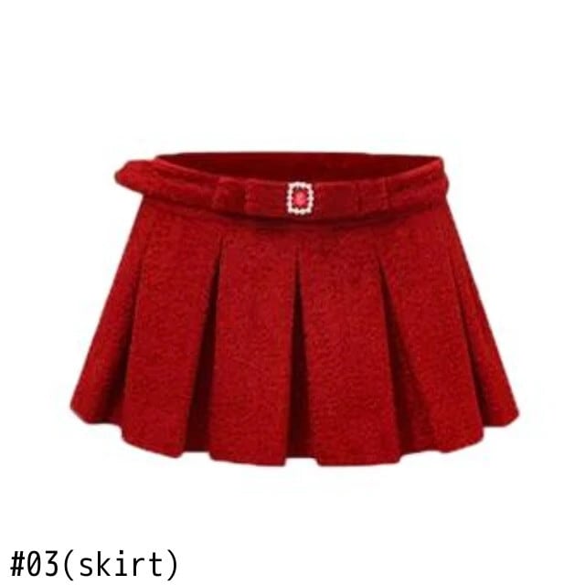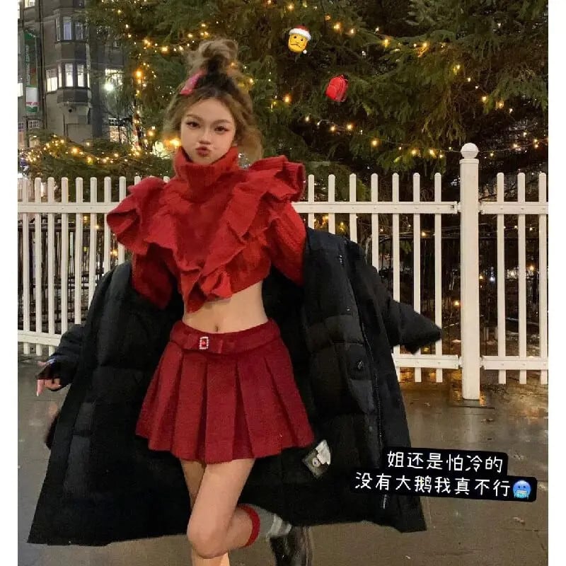 甘いホットガールクリスマススーツ秋ショートフリルセータープリーツ A ラインスカート 2 点セット 大人ガーリー スウィート キュート カジュアル オータム 秋物 Aライン