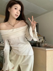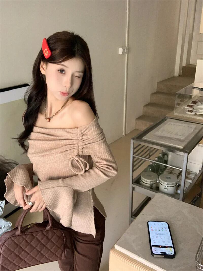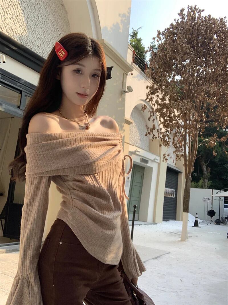 甘いホットガール肥厚オフショルダーセーター秋不規則フレア袖ニットプルオーバー フレアスリーブ 大人ガーリー スウィート キュート カジュアル オータム 秋物