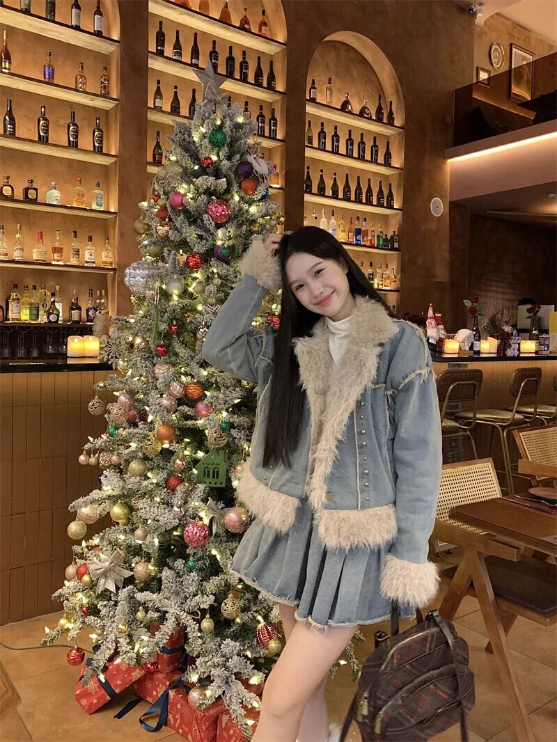 甘いホットガールレトロデニムスーツ冬豪華暖かい綿ジャケットプリーツミニスカート 2 点セット コットン 大人ガーリー スウィート キュート カジュアル ウィンター 冬物