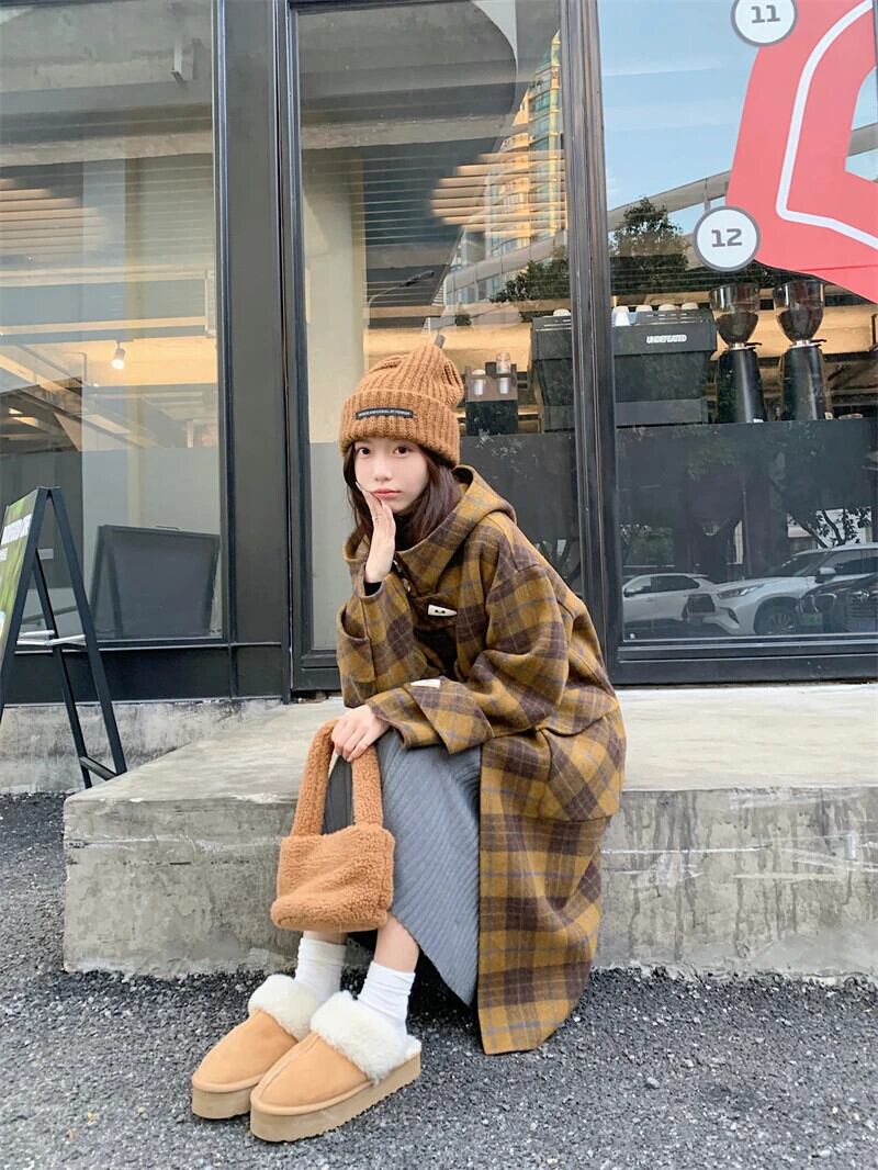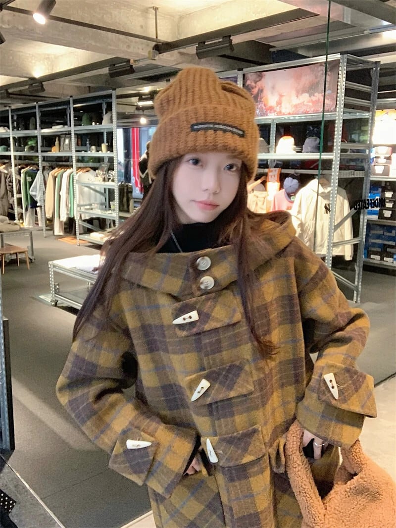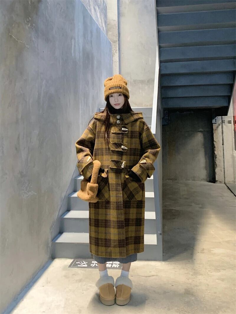 甘いホットガールフード付きホーンボタンチェック柄両面カシミヤコート秋/冬ロングウールコート 大人ガーリー スウィート キュート カジュアル オータム 秋物 ウィンター 冬物