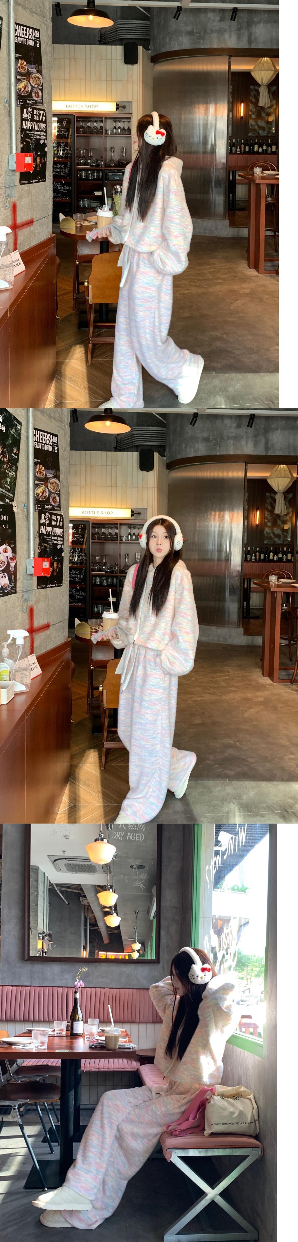 甘い女子かわいいレインボールーズフード付きショートコートウエストカラフルストライプパンツツーピースセット 大人ガーリー スウィート キュート カジュアル
