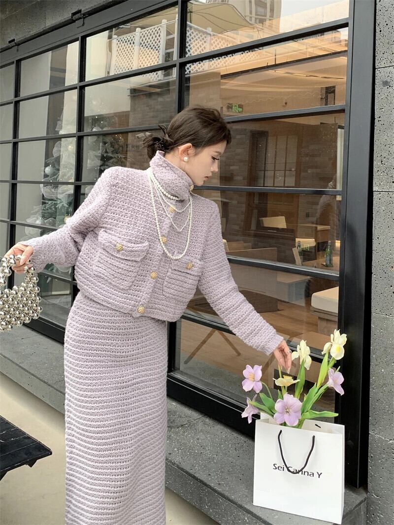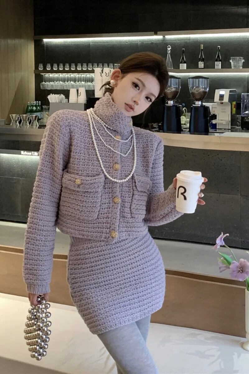 スイートホットガールパープルスーツ秋/冬ニットカーディガンウエストミニスカートツーピースセット 大人ガーリー スウィート キュート カジュアル オータム 秋物 ウィンター 冬物