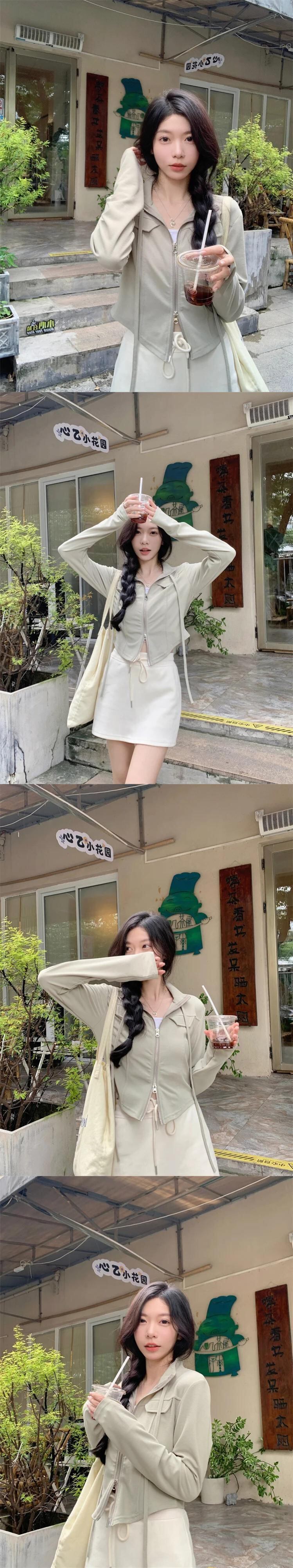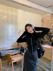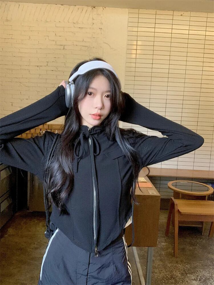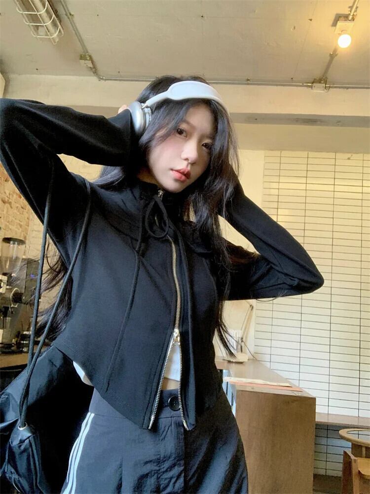 アメリカンスポーツブラックパーカージャケット秋/冬ダブルジッパースリムショートフィッシュボーンカーディガントップ オータム 秋物 ウィンター 冬物