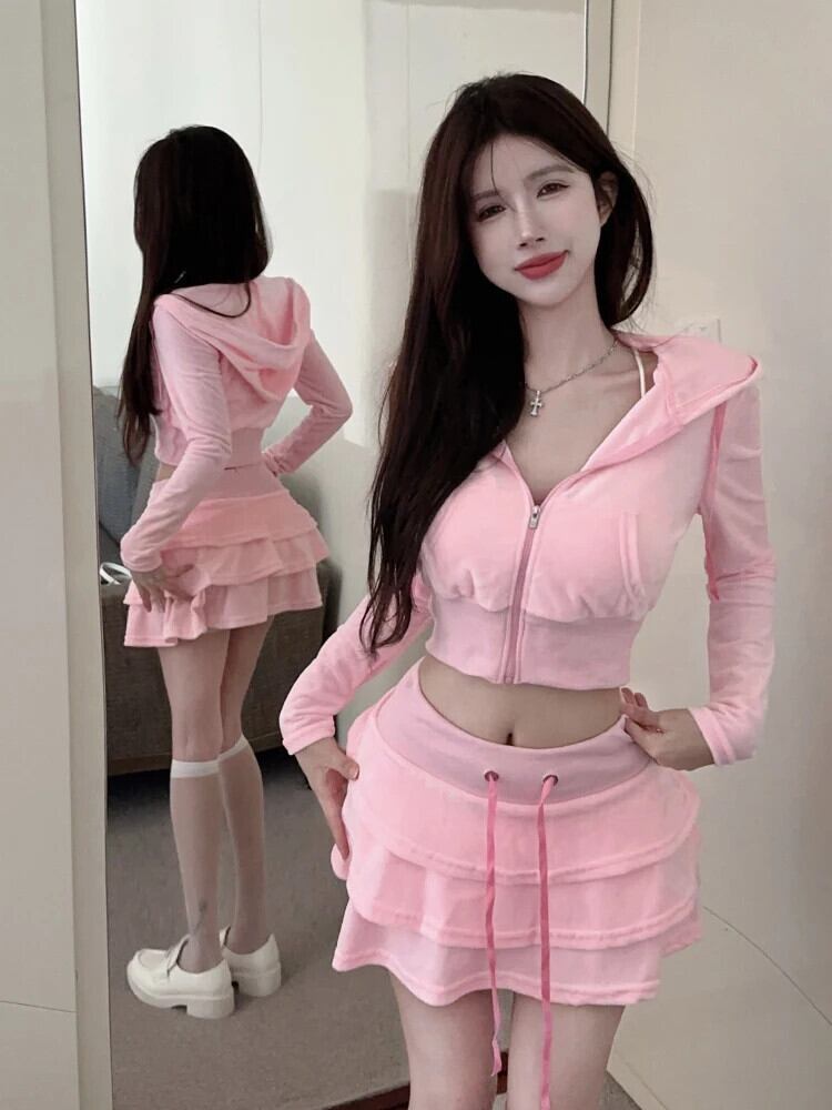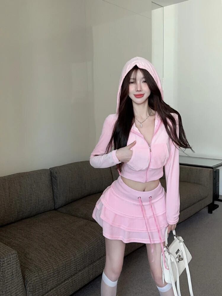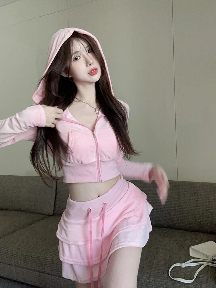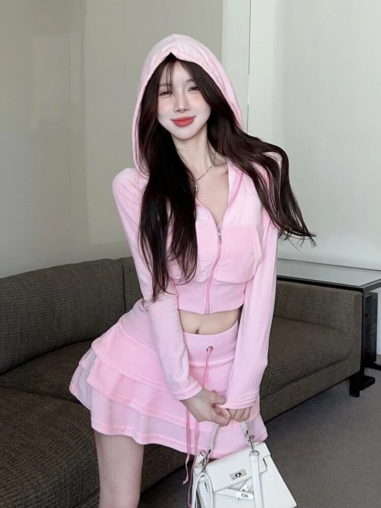 甘いホットガールベルベットスーツ秋/冬ピンクジッパーフード付き長袖コートウエスト A ラインスカート 2 点セット ロング 大人ガーリー スウィート キュート カジュアル オータム 秋物 ウィンター 冬物 Aライン