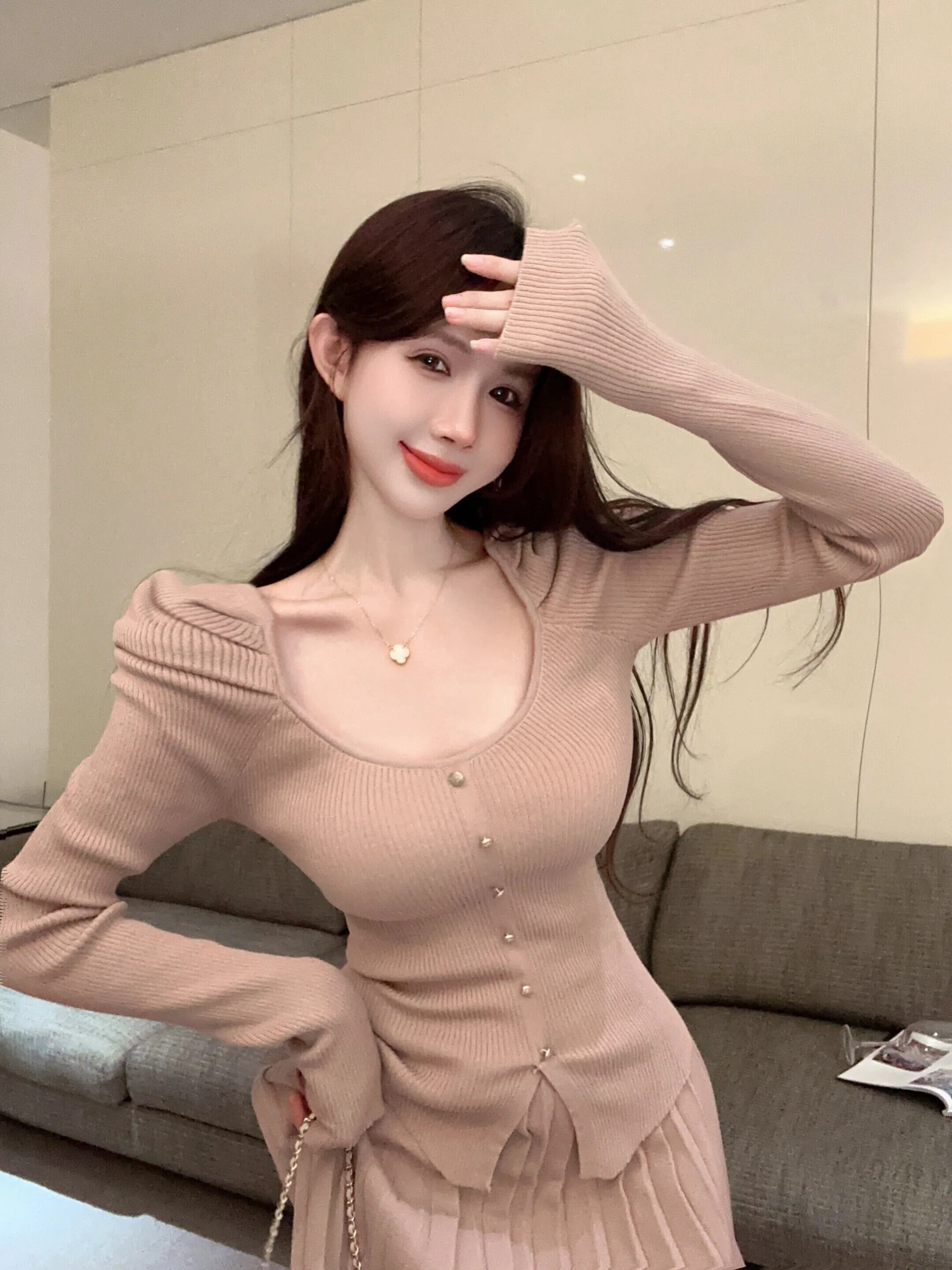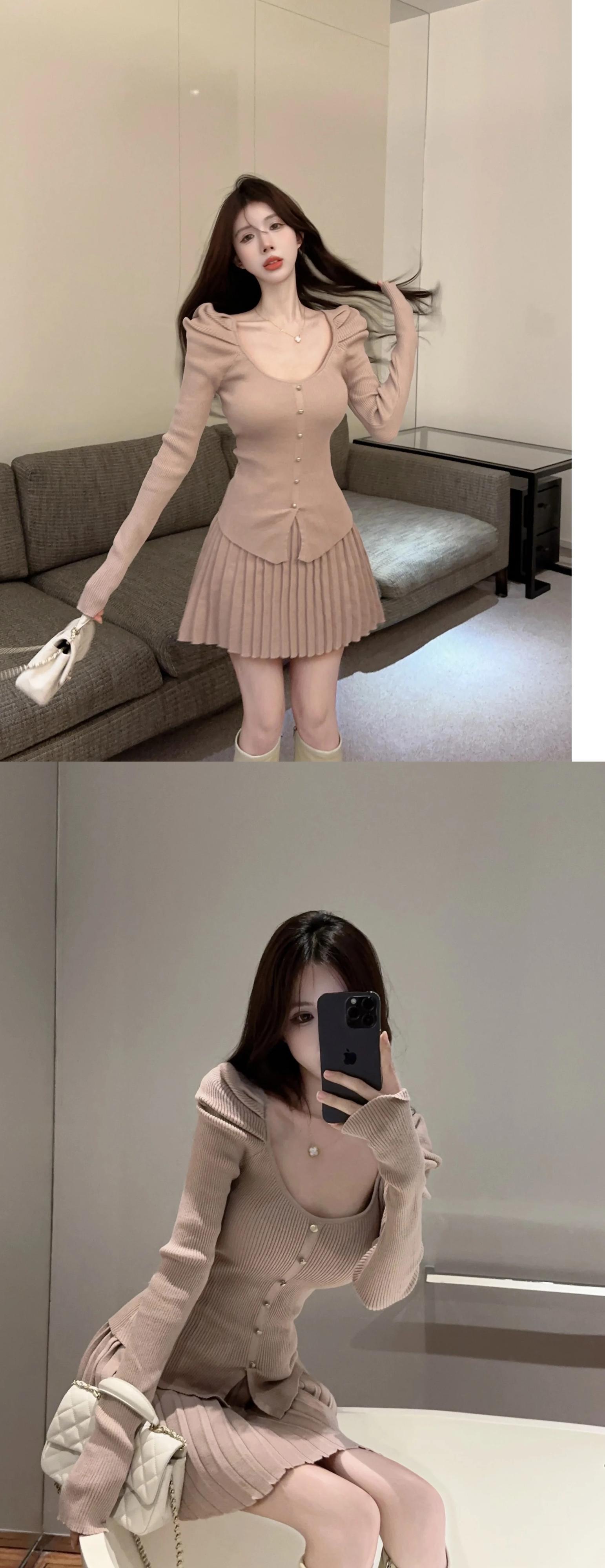 甘いホットガールスーツ秋/冬スクエア襟バブルスリーブニットカーディガン A ラインスカート 2 点セット 大人ガーリー スウィート キュート カジュアル オータム 秋物 ウィンター 冬物 Aライン スクウェア