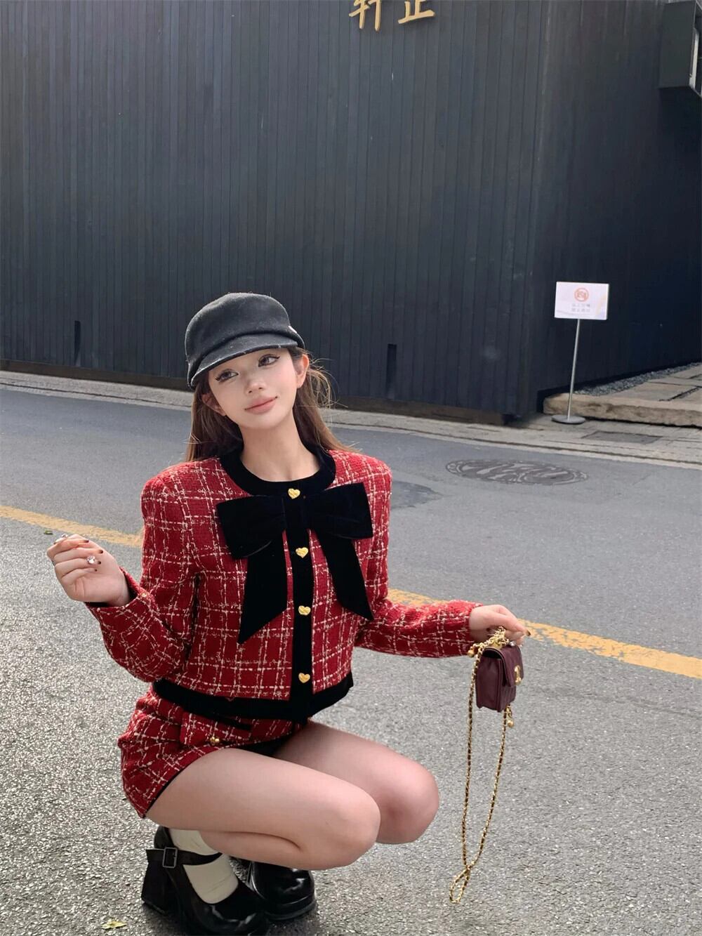 スイートホットガールスーツ秋/冬ボウコートウエストラップヒップミニスカートレッドツーピースセット リボン 大人ガーリー スウィート キュート カジュアル オータム 秋物 ウィンター 冬物