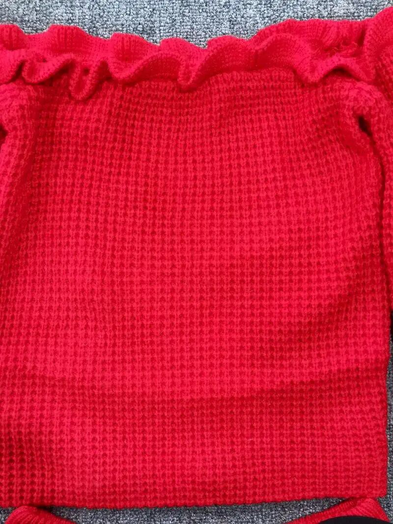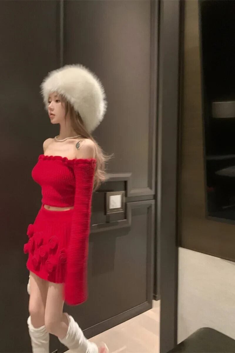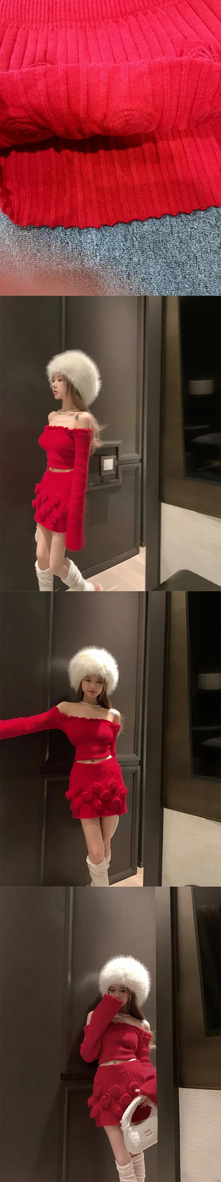 純粋セクシーホットガールスーツ秋/冬オフショルダーセーター三次元レッドローズニットミニスカートツーピースセット オータム 秋物 ウィンター 冬物