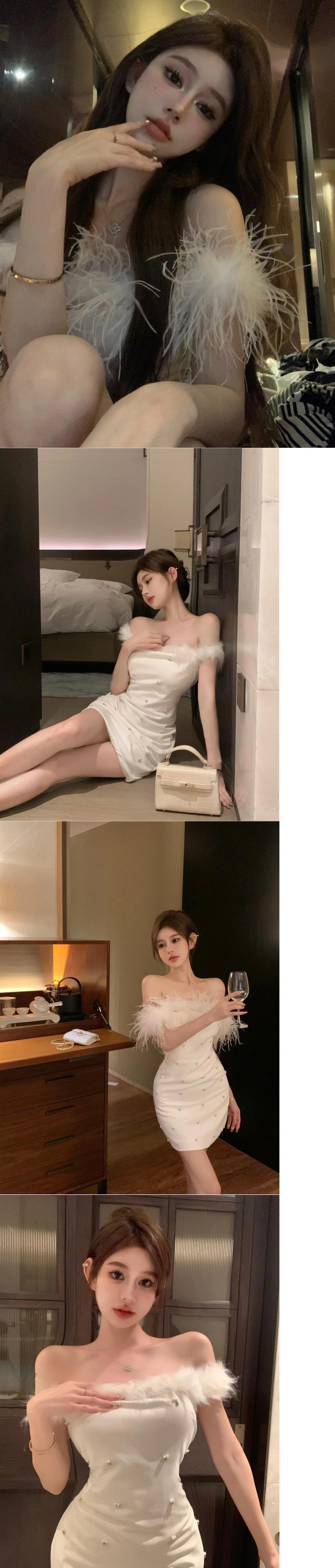 甘いホットガール毛皮襟ストラップレスドレス秋スリムオフショルダーパールセクシーショートドレス 大人ガーリー スウィート キュート カジュアル オータム 秋物 真珠
